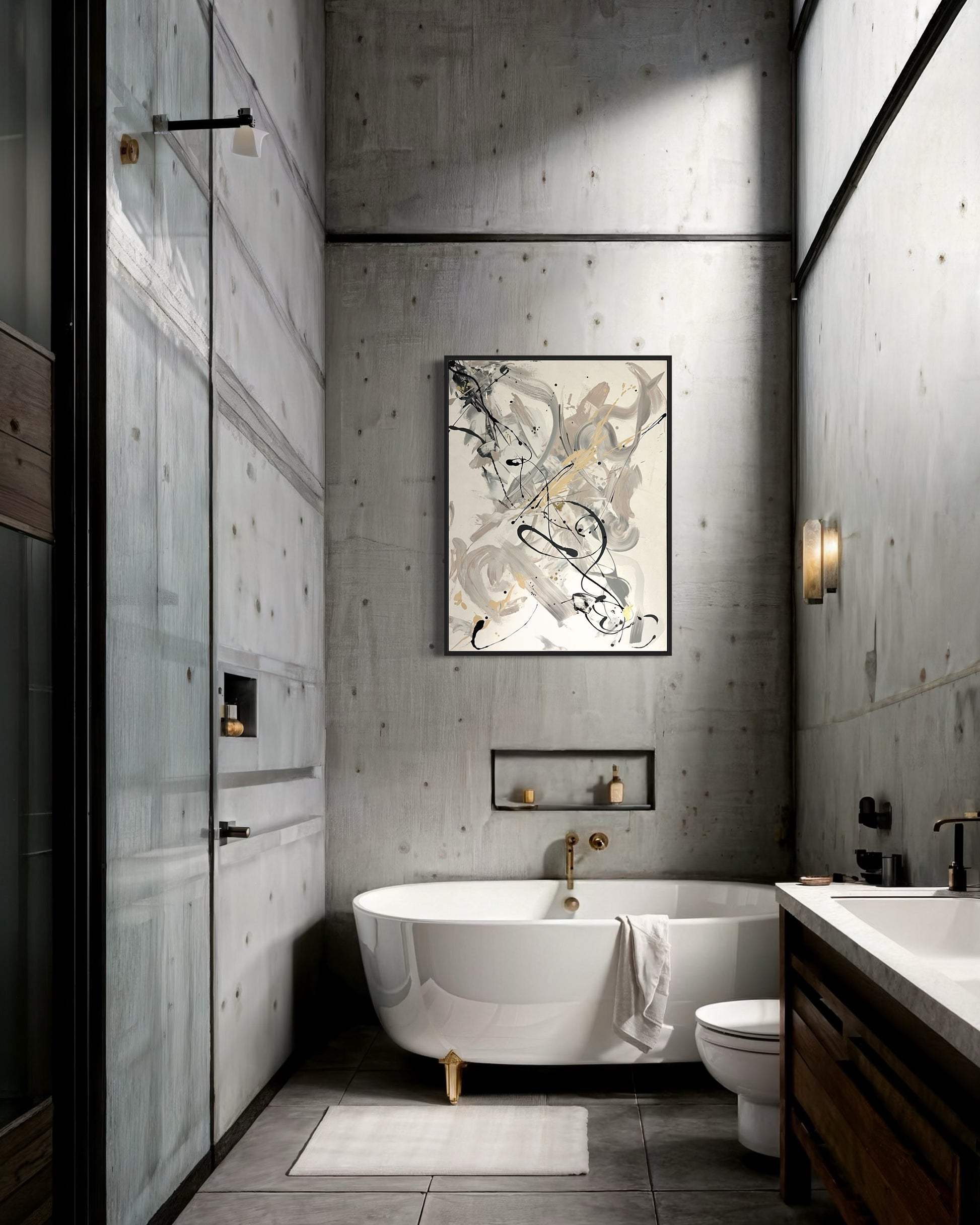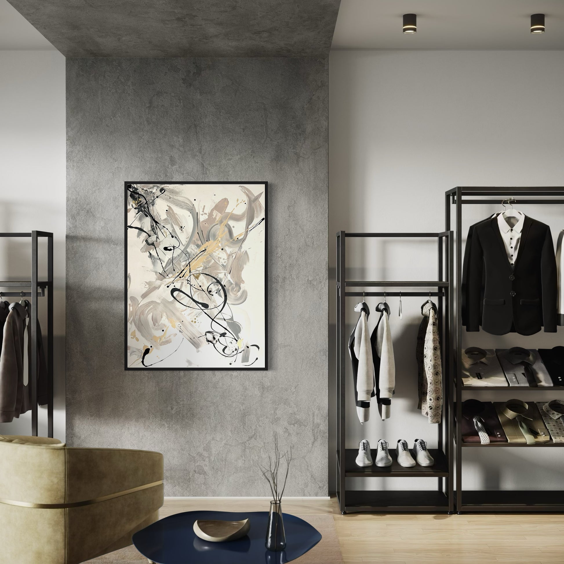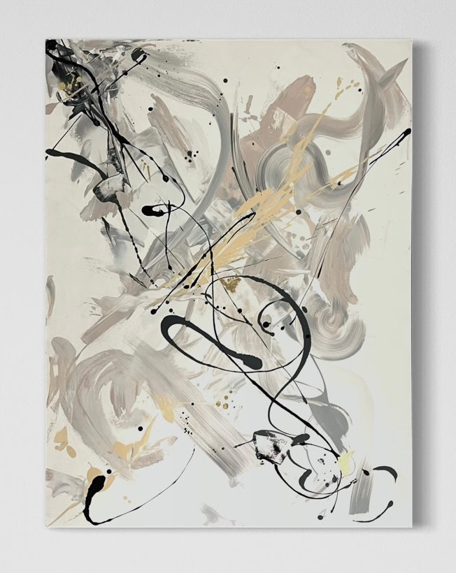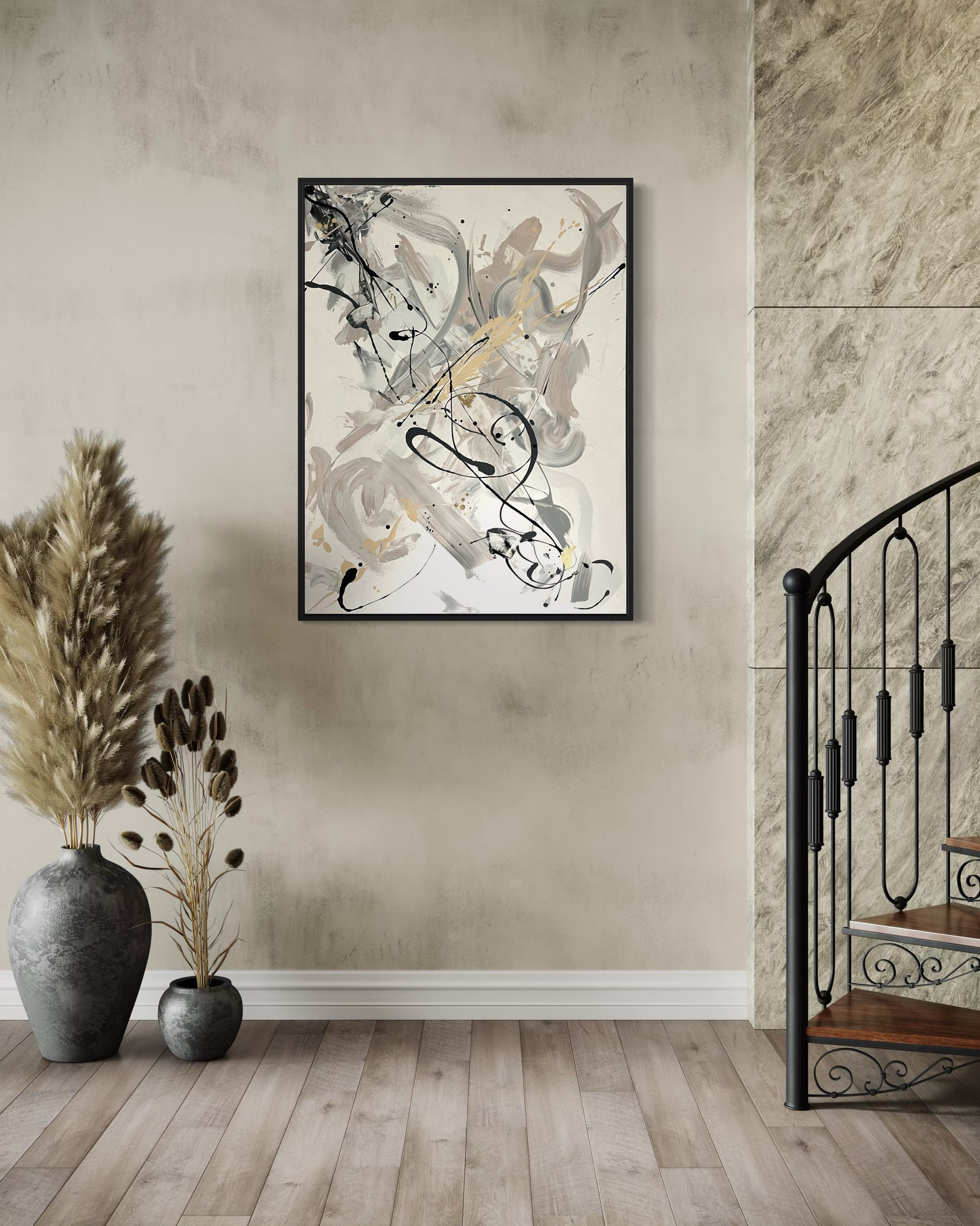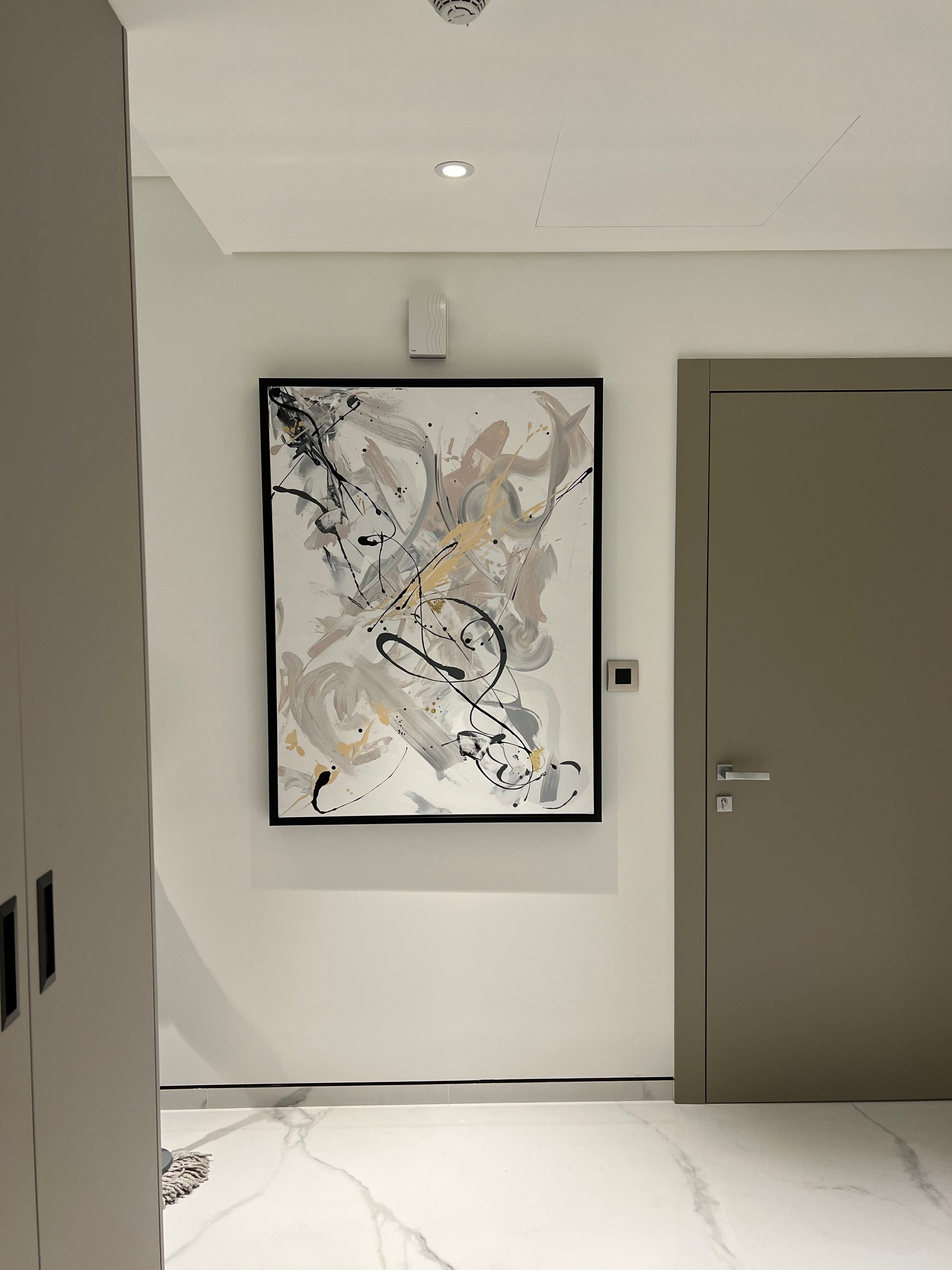 This custom-made painting was designed to elevate a contemporary interior, bringing a youthful, energetic vibe to the space. The dynamic composition features bold, chaotic lines in a variety of shapes and forms, creating a vibrant sense of movement and energy across the canvas. The bold black lines and soft nude tones stand out against each other, creating a harmonious balance that draws the eye, while giving the piece depth and presence in any room.