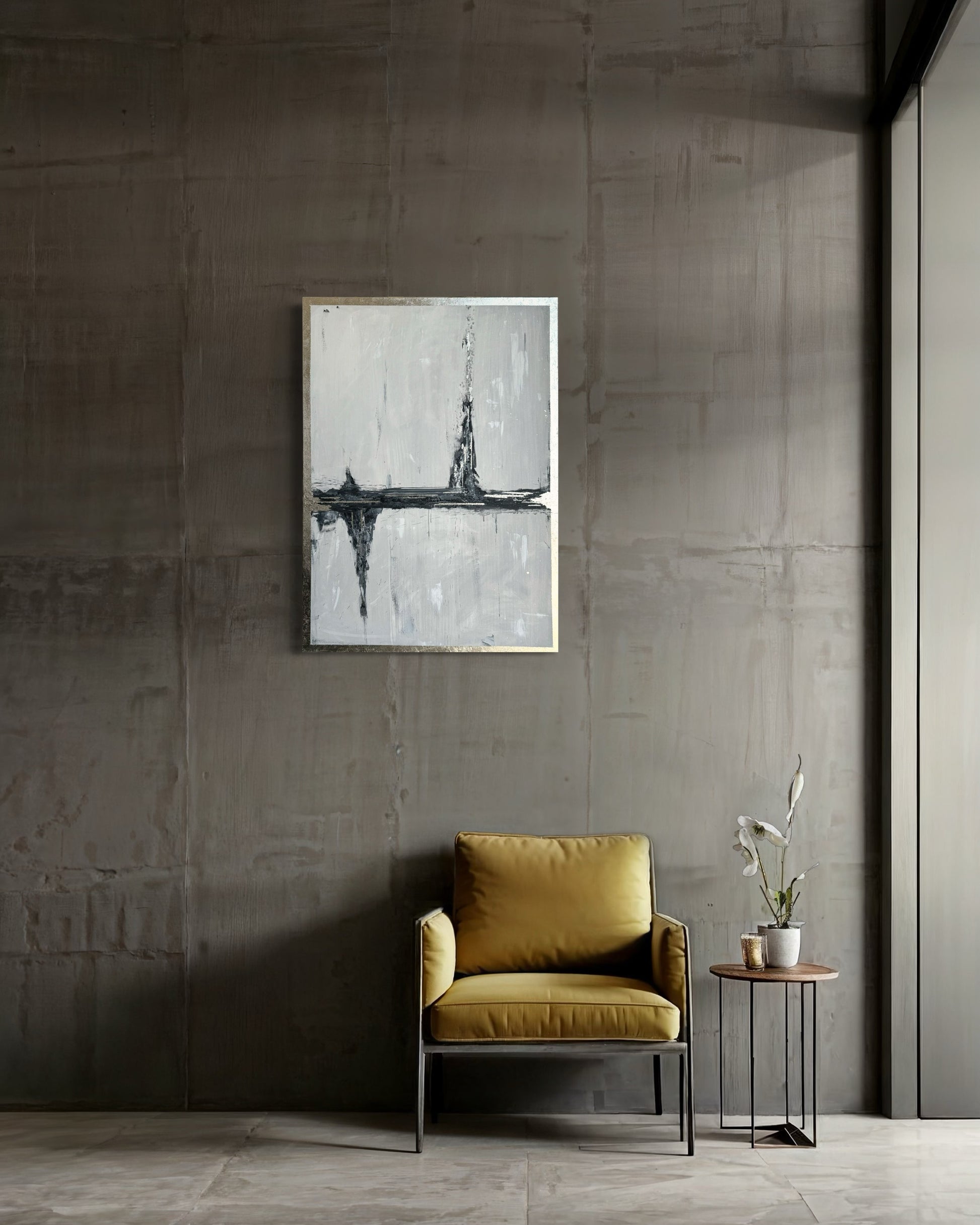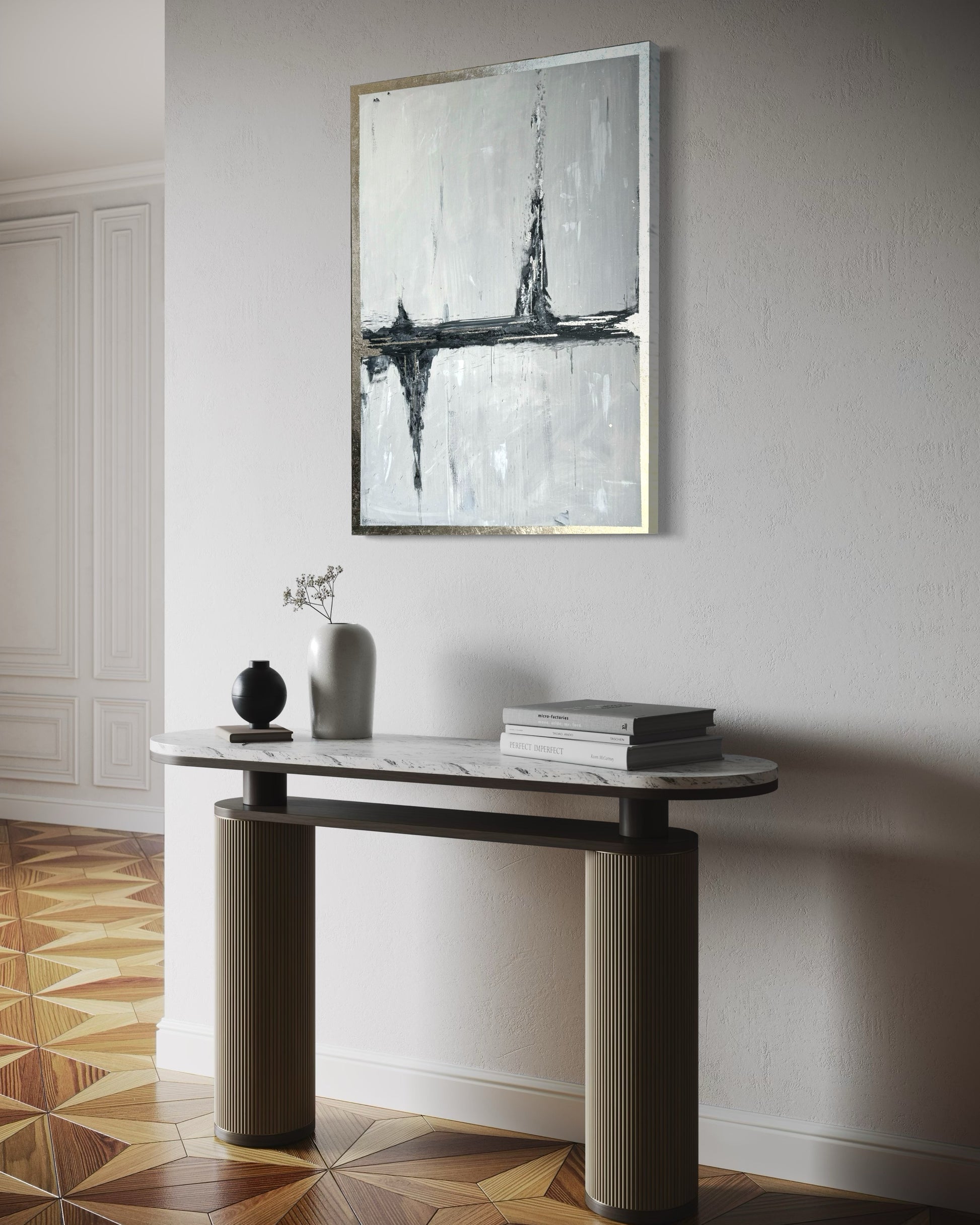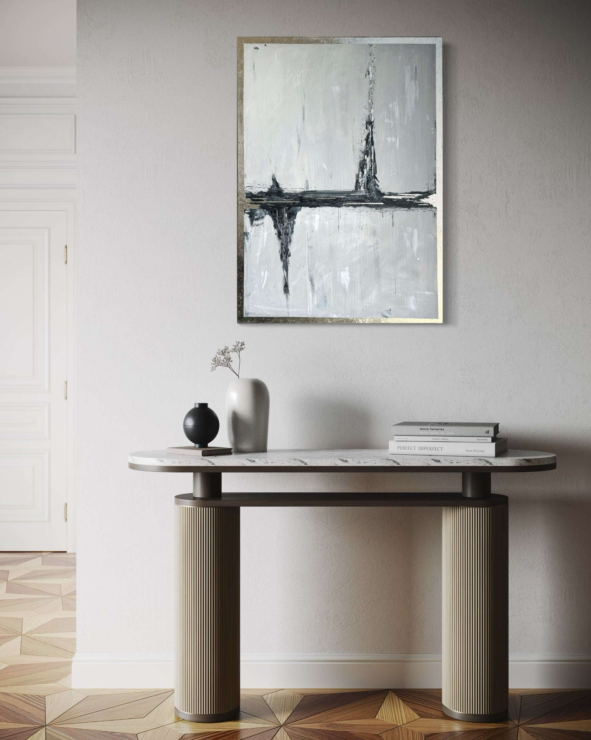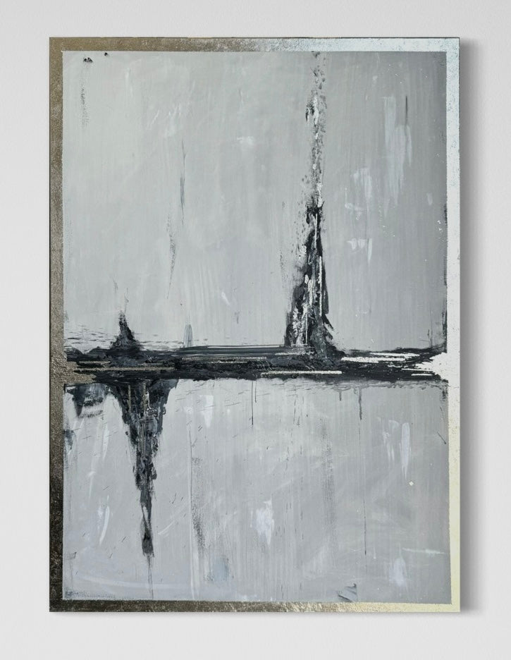 This custom-made abstract artwork was designed to elevate contemporary interiors, bringing both style and individuality to the space. The piece highlights silver leaf as its central element, adding a touch of luxury and brilliance. The dark black and grey tones create a textured backdrop, producing a subtle, reflective glow that enriches the overall depth of the composition. This artwork effortlessly blends elegance and modernity, making it a captivating statement piece for any room.