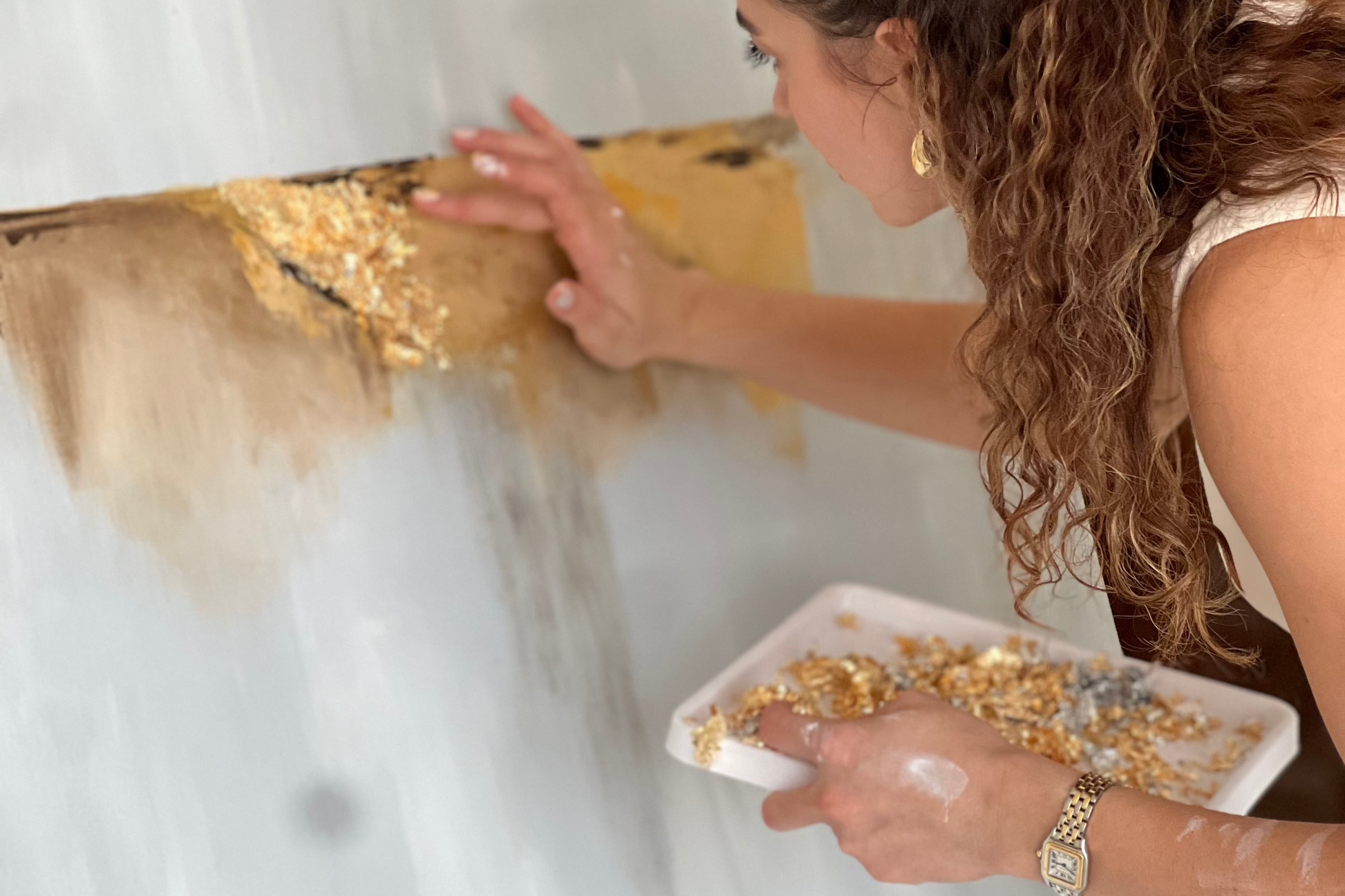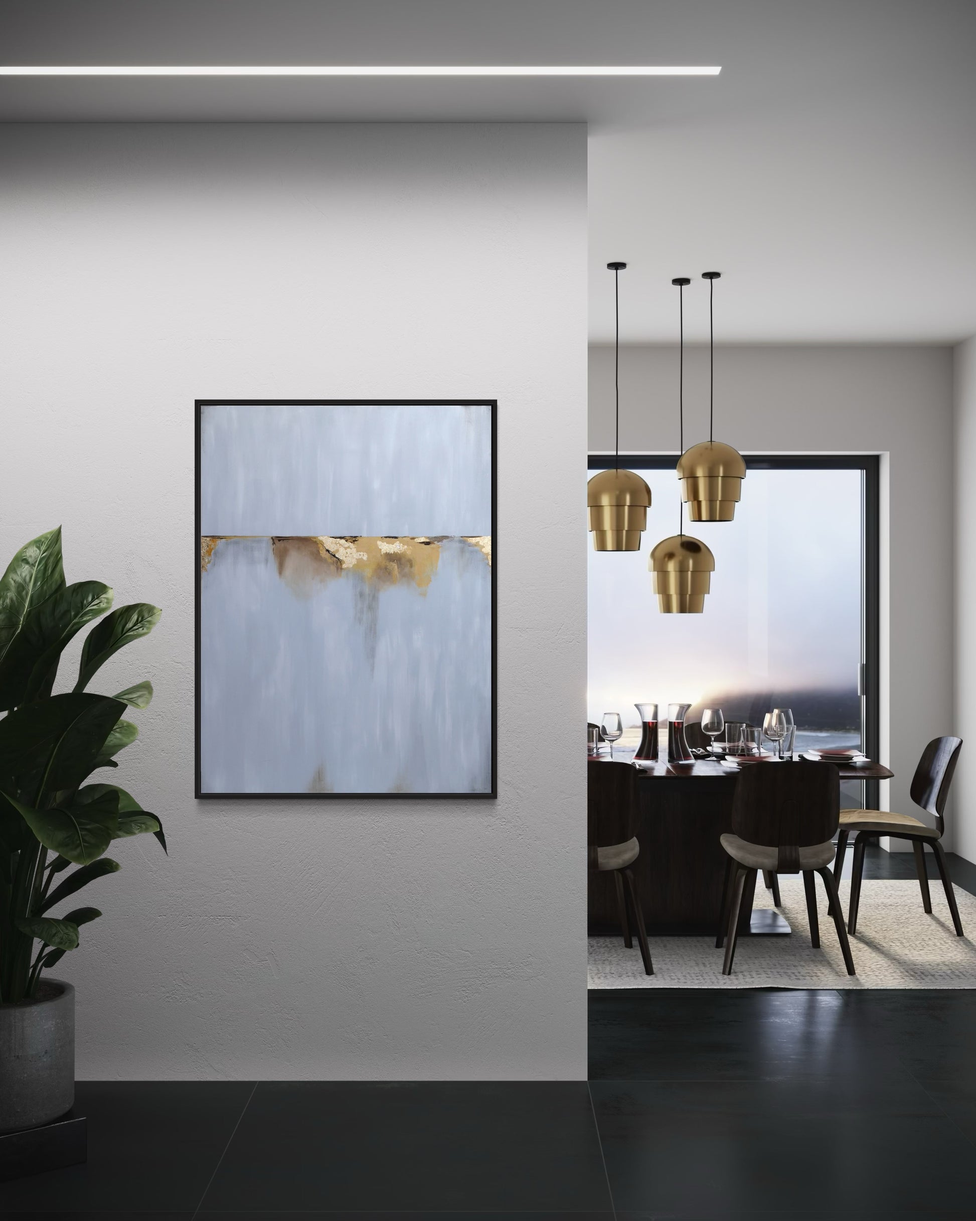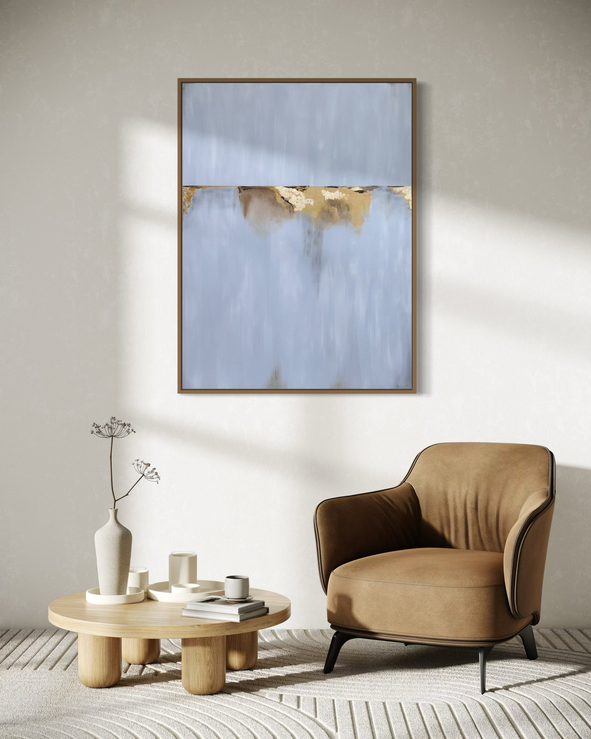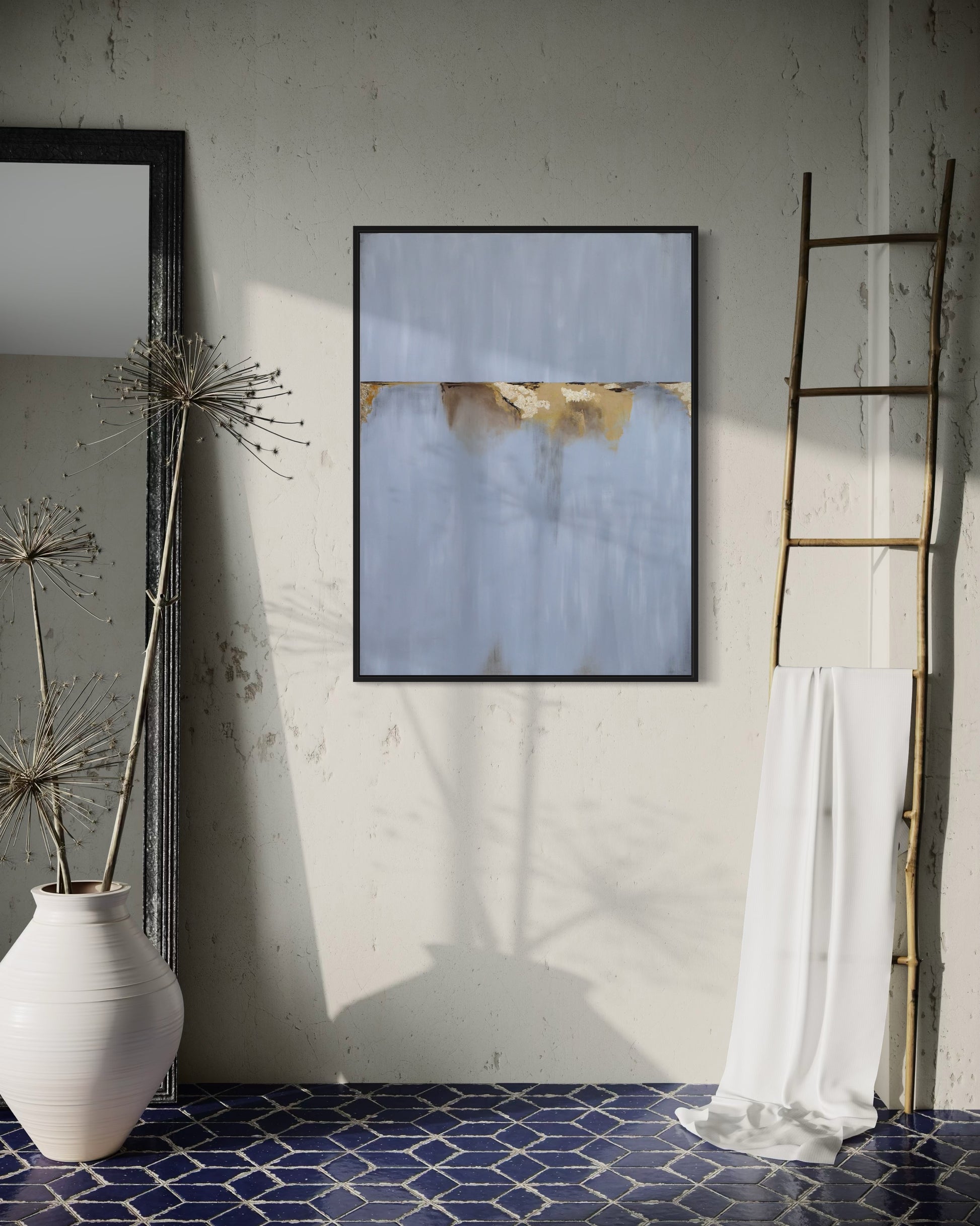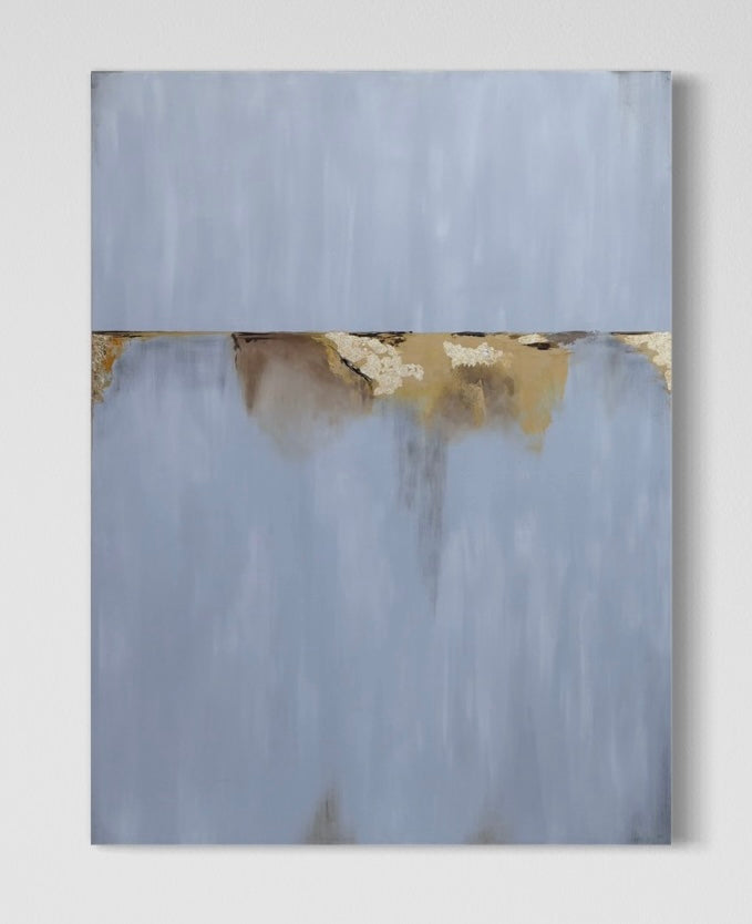 This custom-made artwork was designed specifically to enhance the beauty of a space and create a unique atmosphere. Soft blue tones seamlessly blend across the canvas, creating a tranquil ambiance. Delicate accents of gold are thoughtfully applied, adding a touch of sophistication and warmth that enriches the overall composition. This piece acts as both a striking focal point and a refined addition, bringing serene elegance to any room.