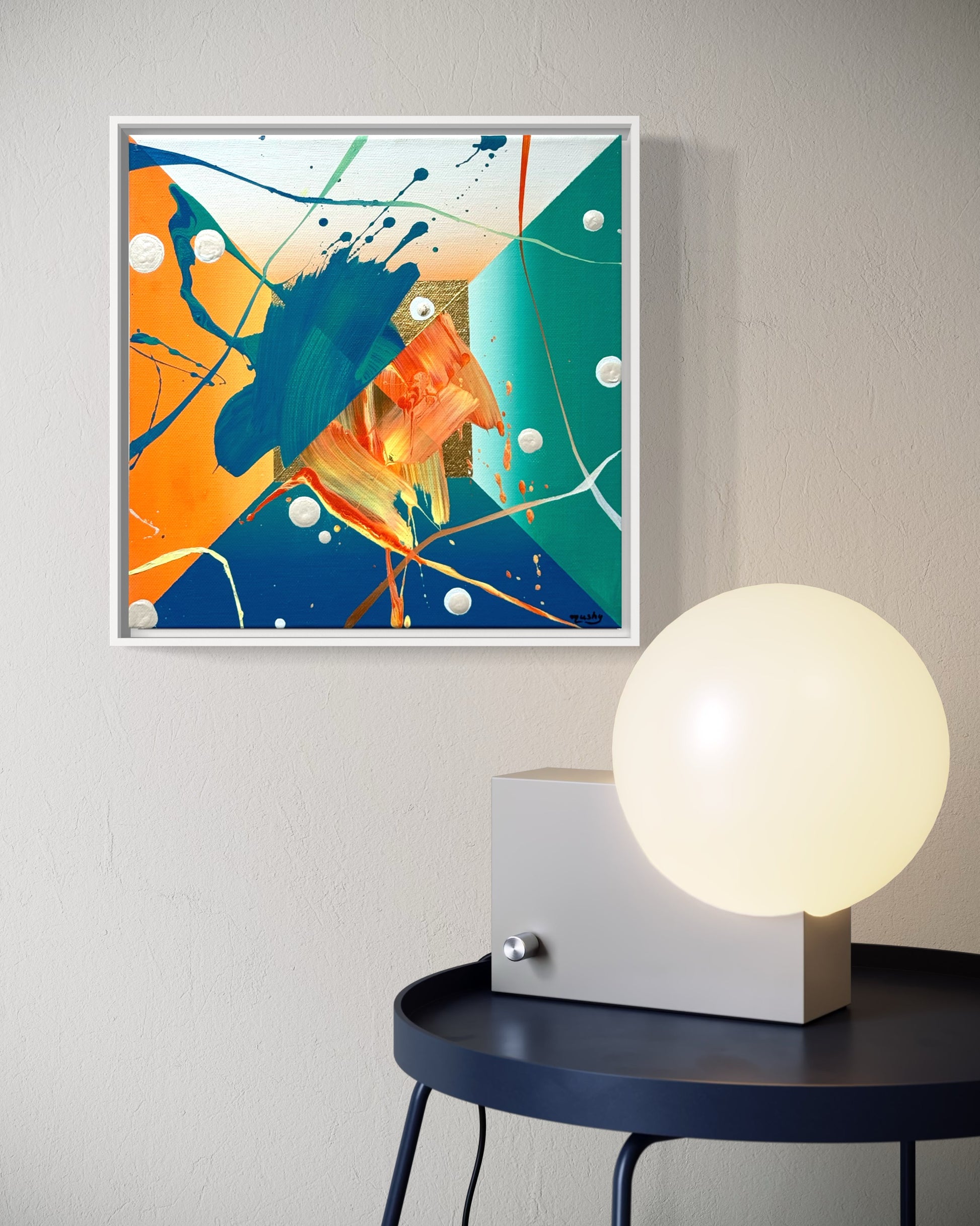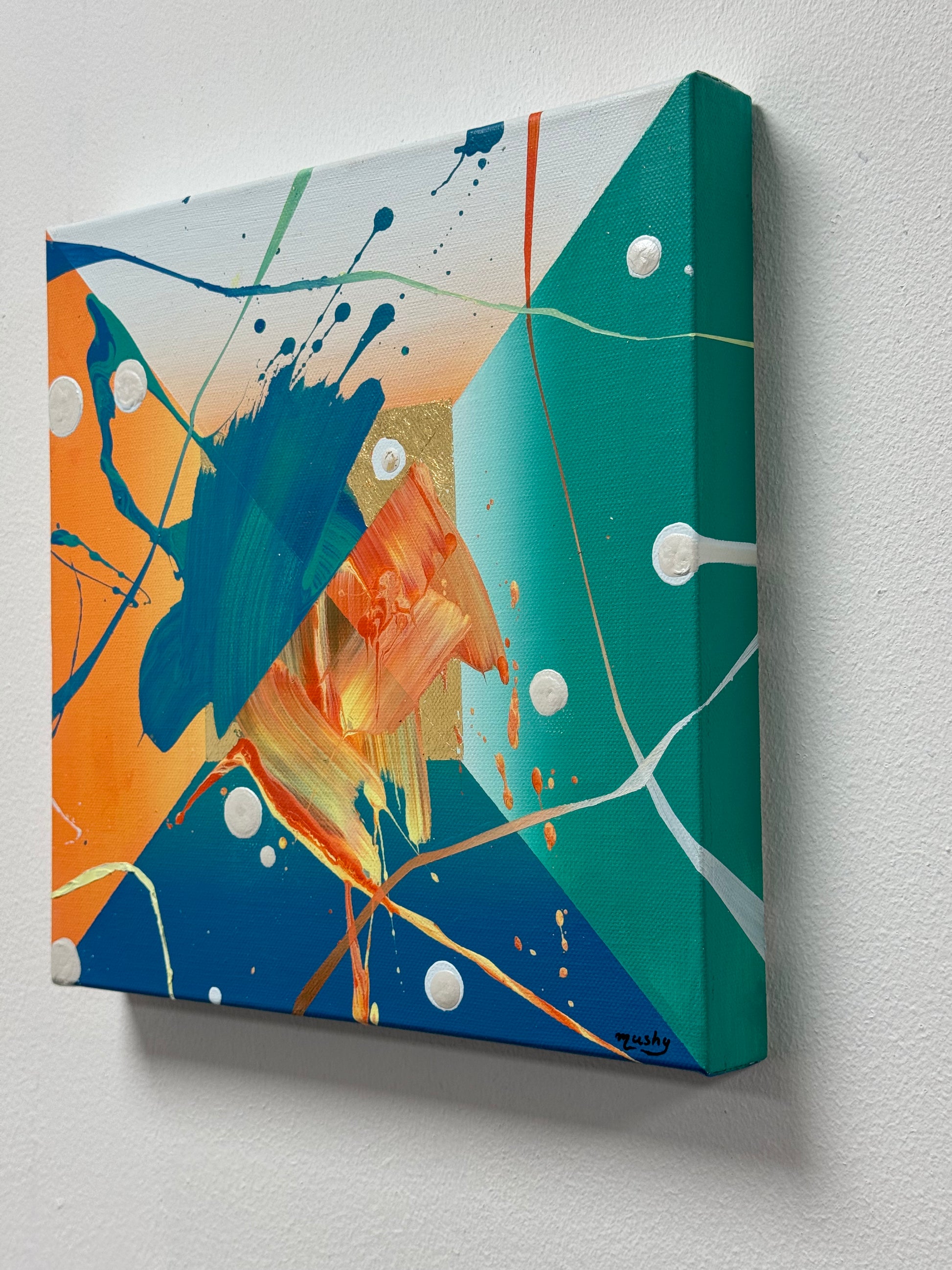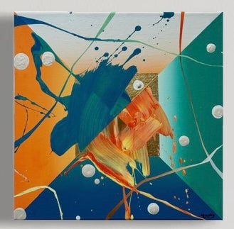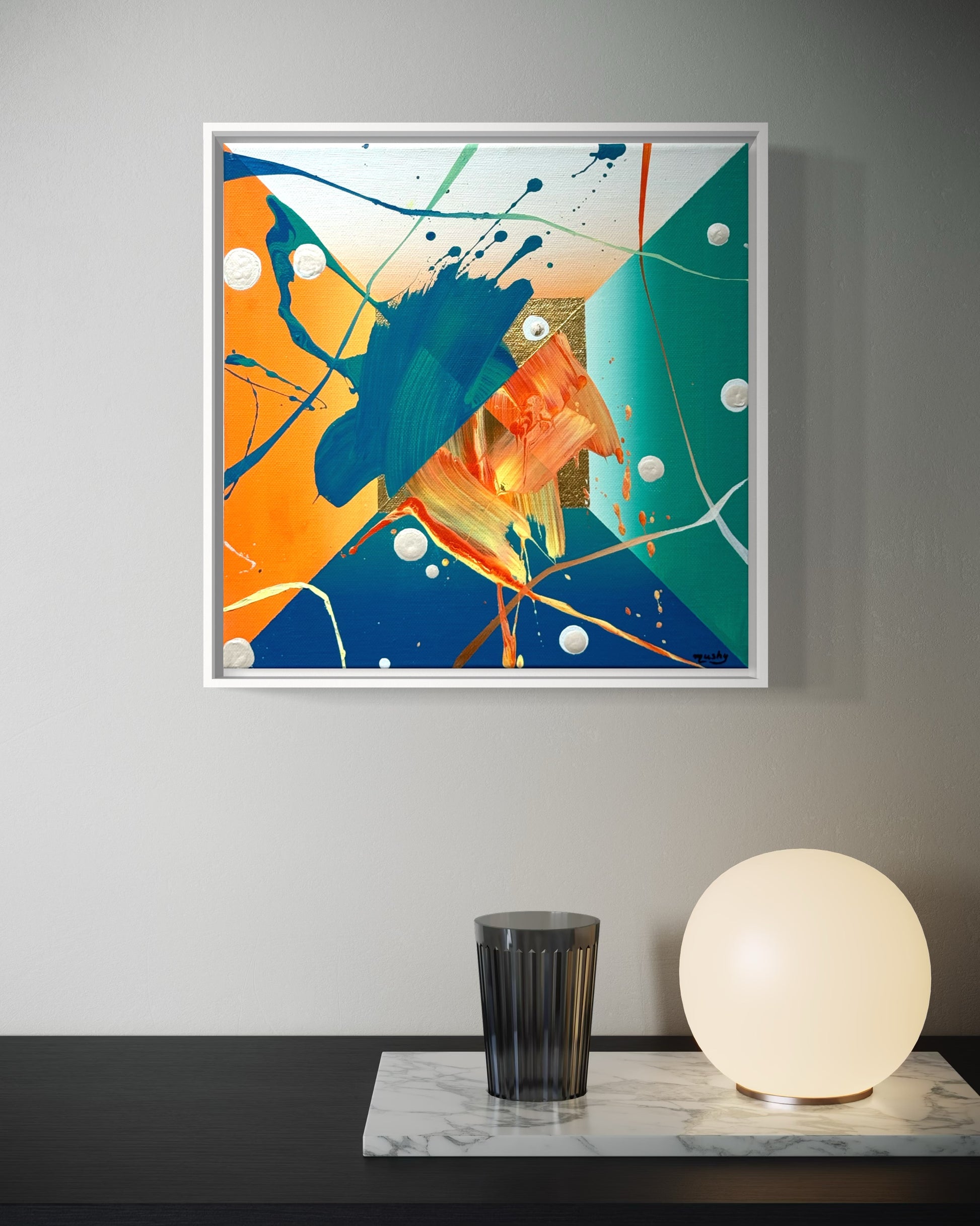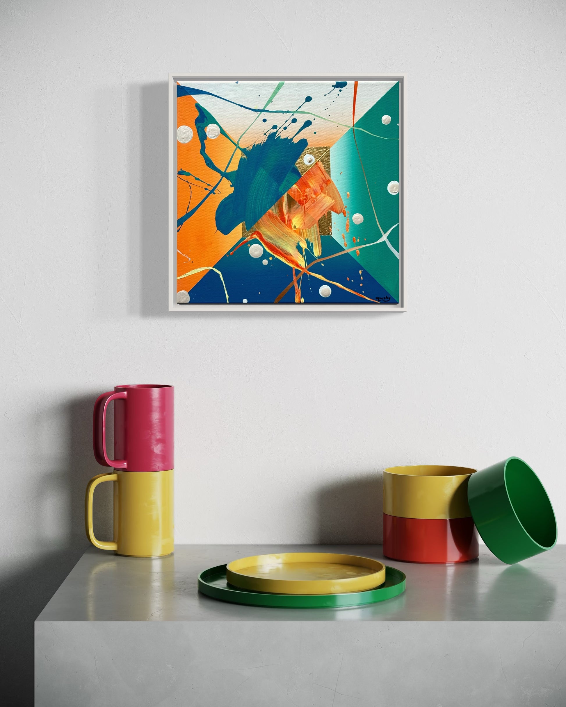 This artwork features a bold combination of four distinct colors, seamlessly blended together in the background to create a rich and vibrant foundation. In the center, a dynamic splash of colors erupts, adding movement and energy to the composition. Dots scattered throughout the piece help tie everything together, guiding the eye and adding rhythm. The overall effect is one of lively motion and fluidity, with a sense of controlled chaos. The margins of the canvas are perfectly finished, giving the artwork a clean and polished look that contrasts beautifully with the dynamic center, creating a stunning visual balance.