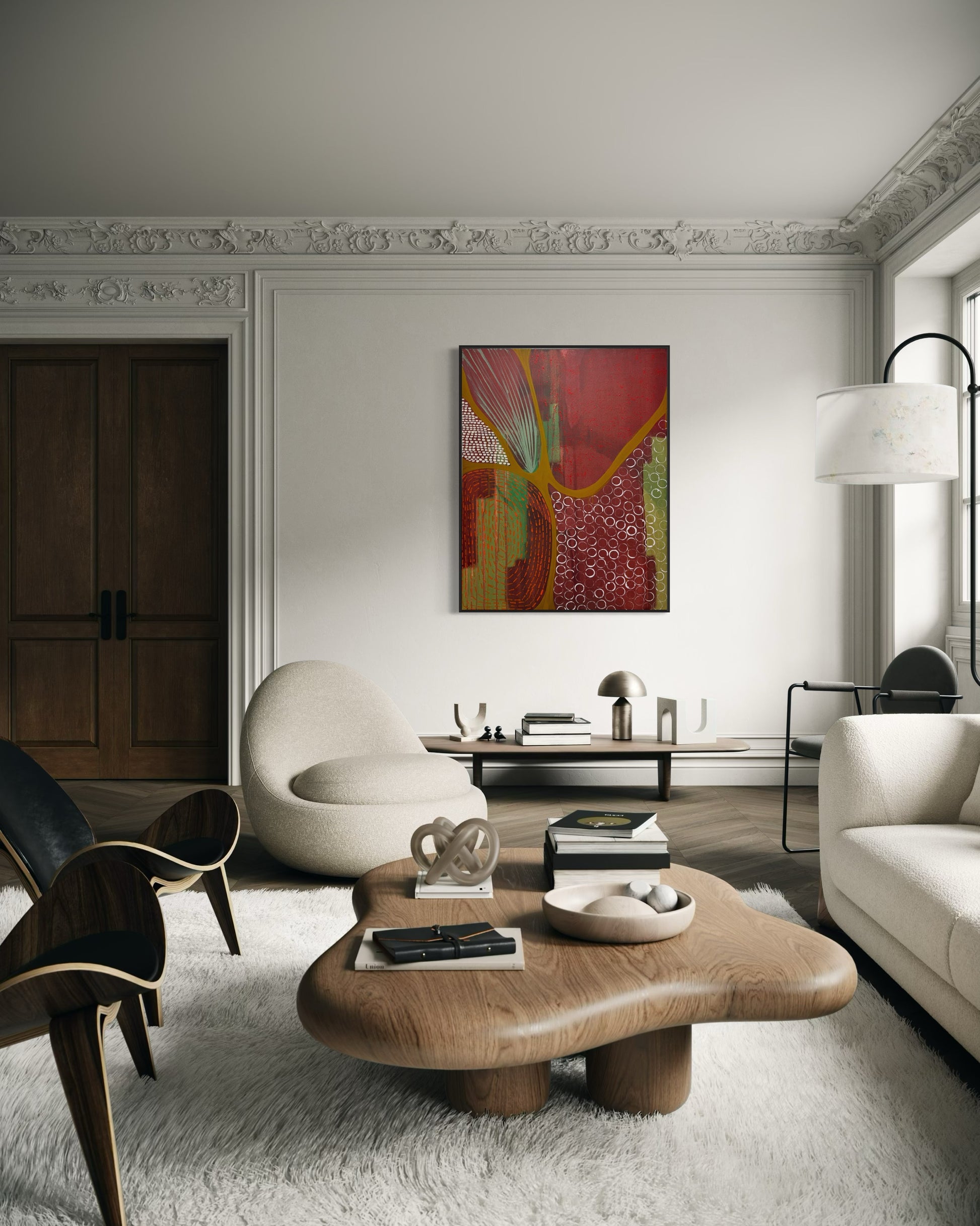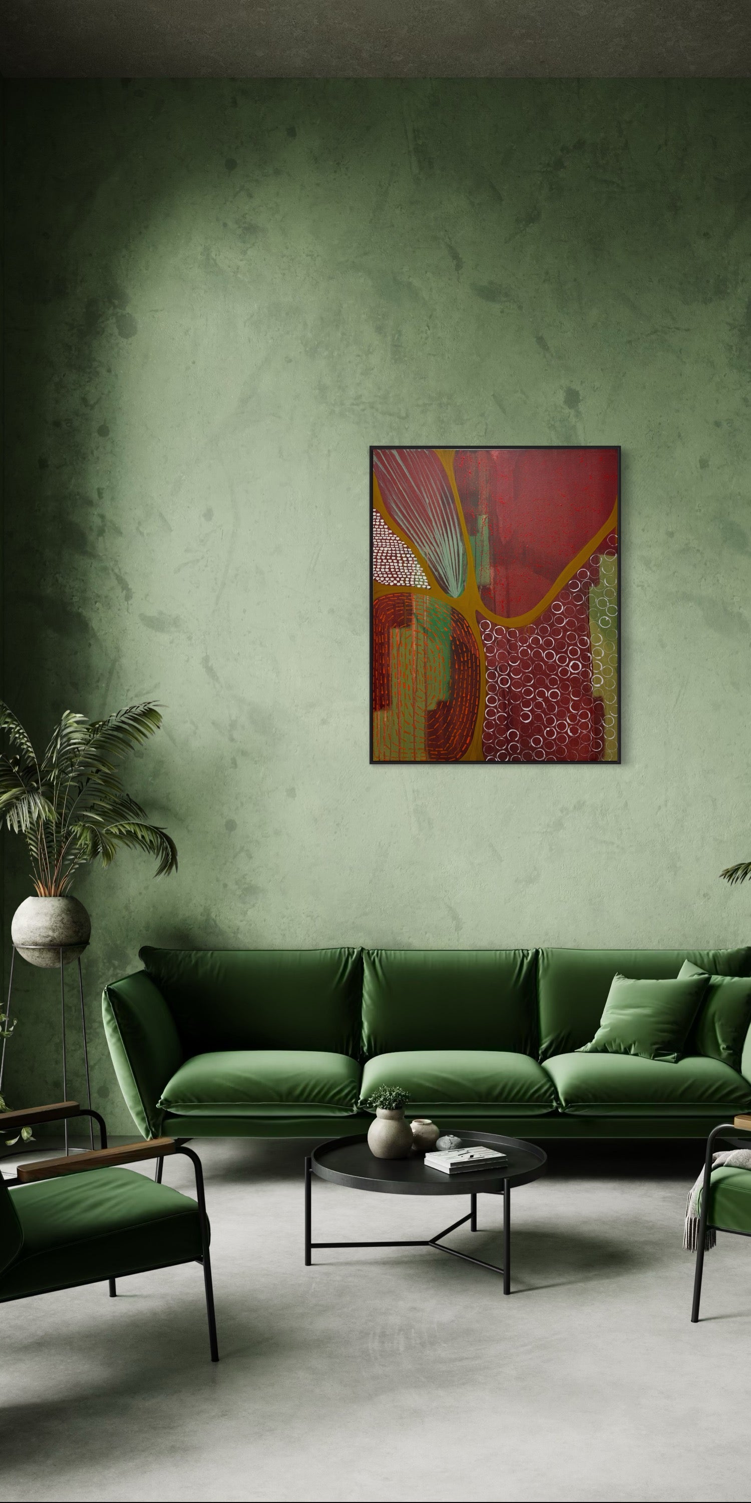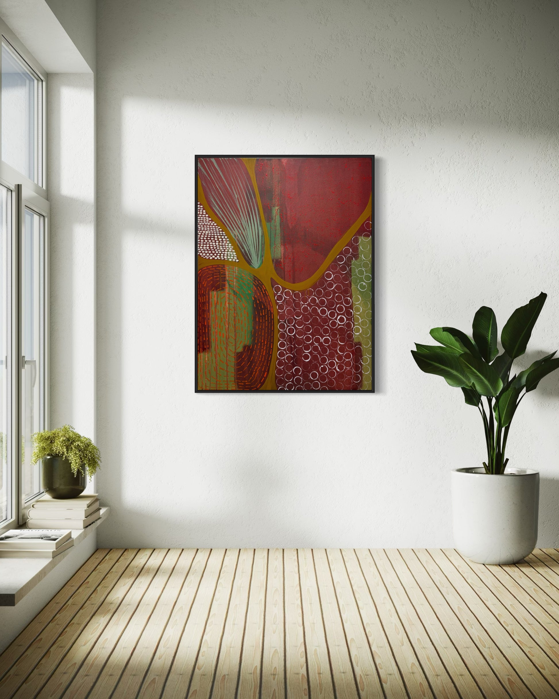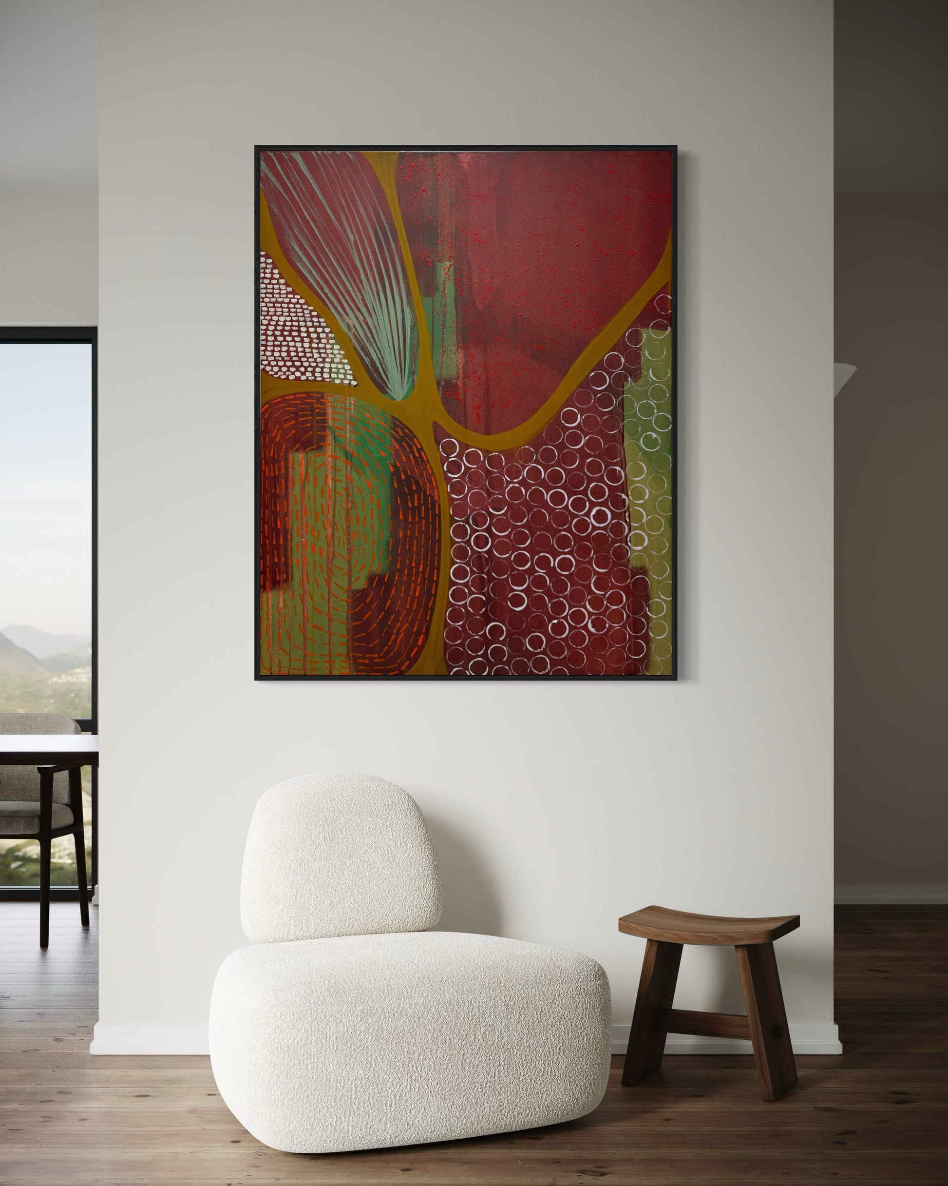 This artwork blends soft, muted shades of red and green, evoking a sense of harmony and quiet strength. The calming colors, merged with subtle tones, create a balanced and serene atmosphere. The composition is enriched with geometric patterns and ethnic-inspired elements, suggesting a connection to ancient traditions and roots. The rhythm of the shapes and the gentle color palette invites viewers to reflect on timelessness and the beauty of cultural heritage, offering a modern yet respectful tribute to the past.