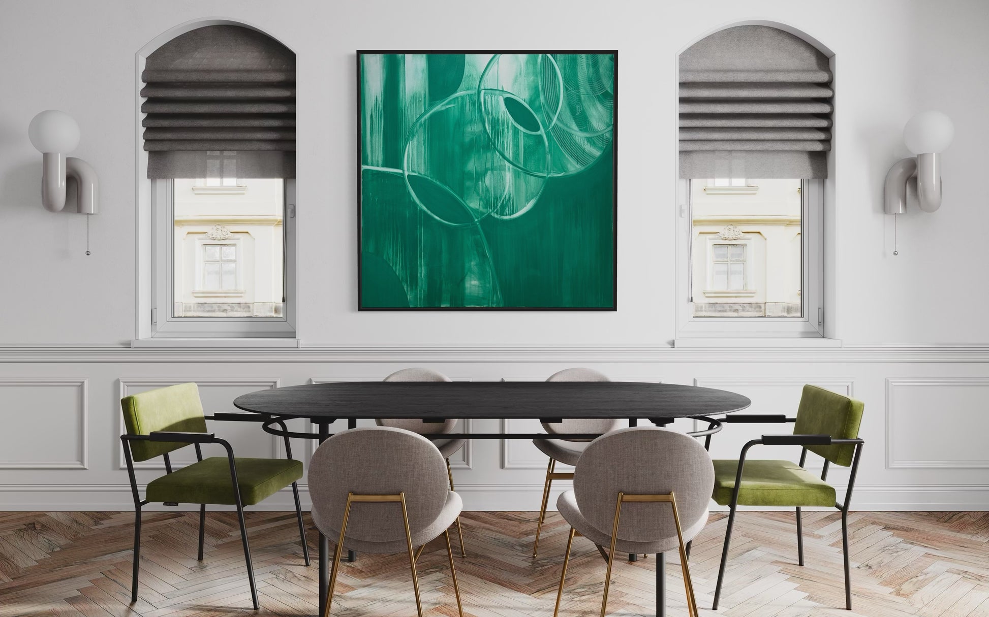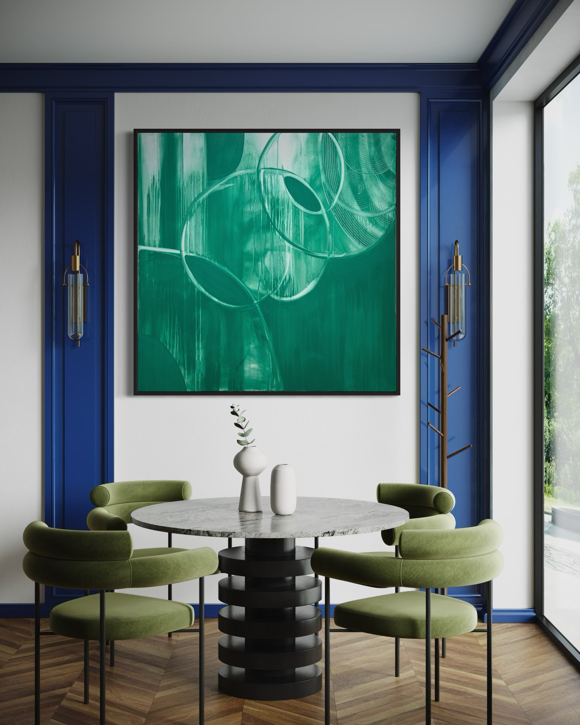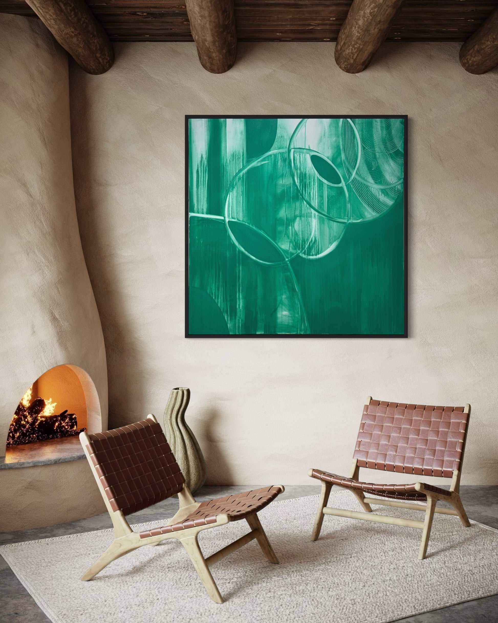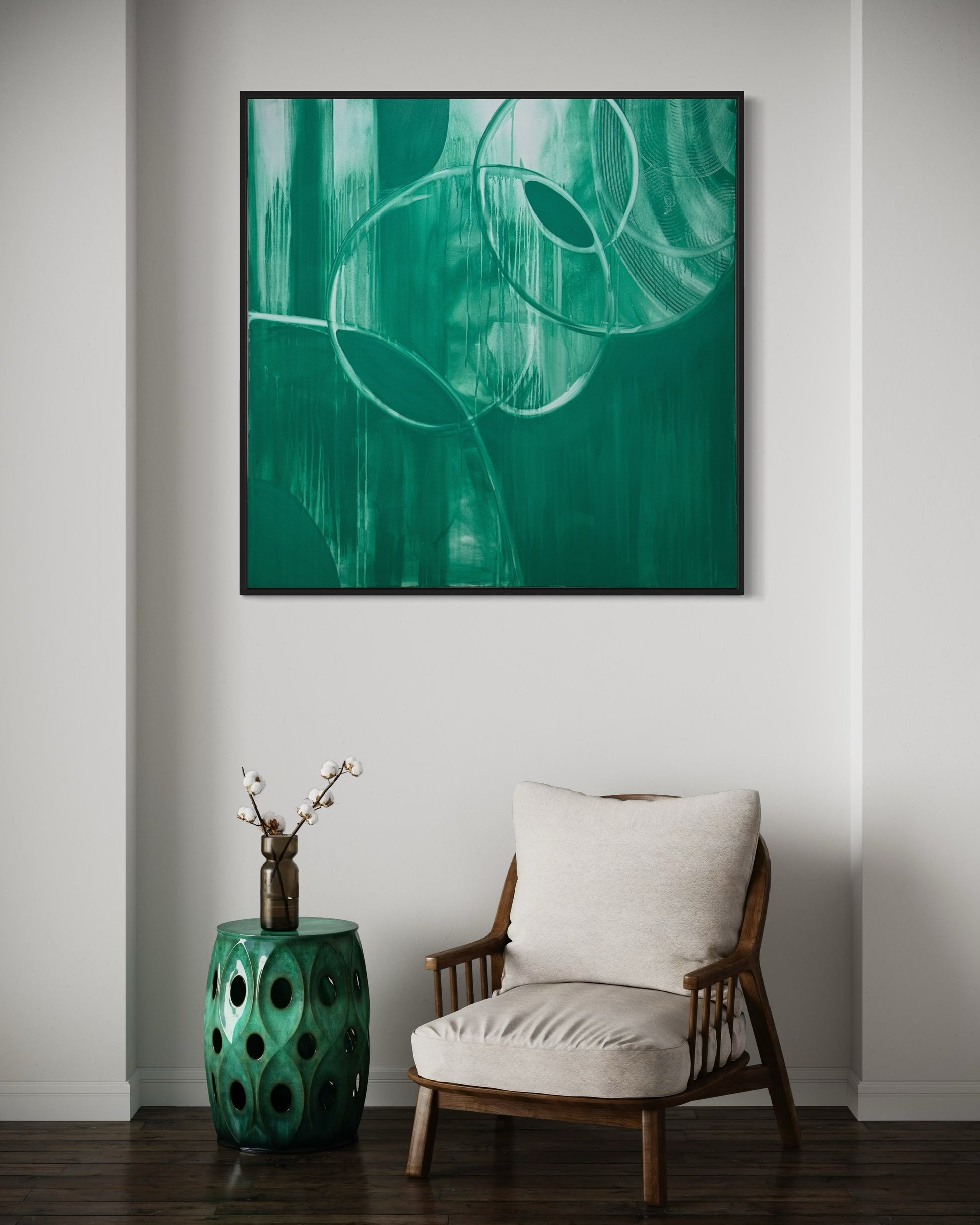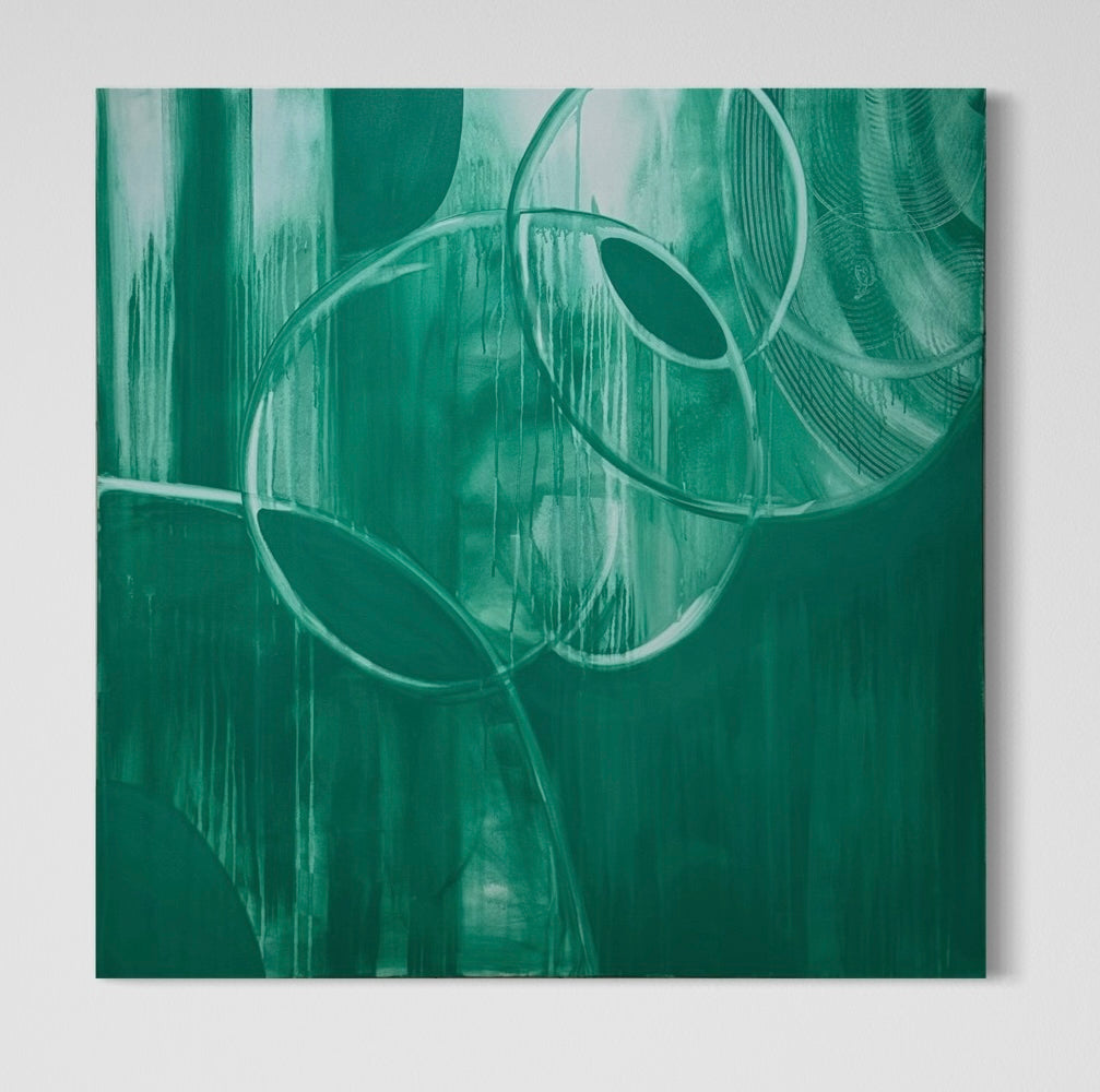 This artwork was created using a singular jungle green color, evoking a sense of strangeness and alien qualities. The composition features geometric, asymmetrical movements that break free from traditional shapes, challenging familiar structures. The monochromatic palette enhances the feeling of uniqueness, drawing the viewer into a surreal experience. The simplicity of the colour contrasts with the complexity of the design, creating an atmosphere that is both intriguing and thought-provoking, as if inviting you into a world that is unfamiliar yet captivating.