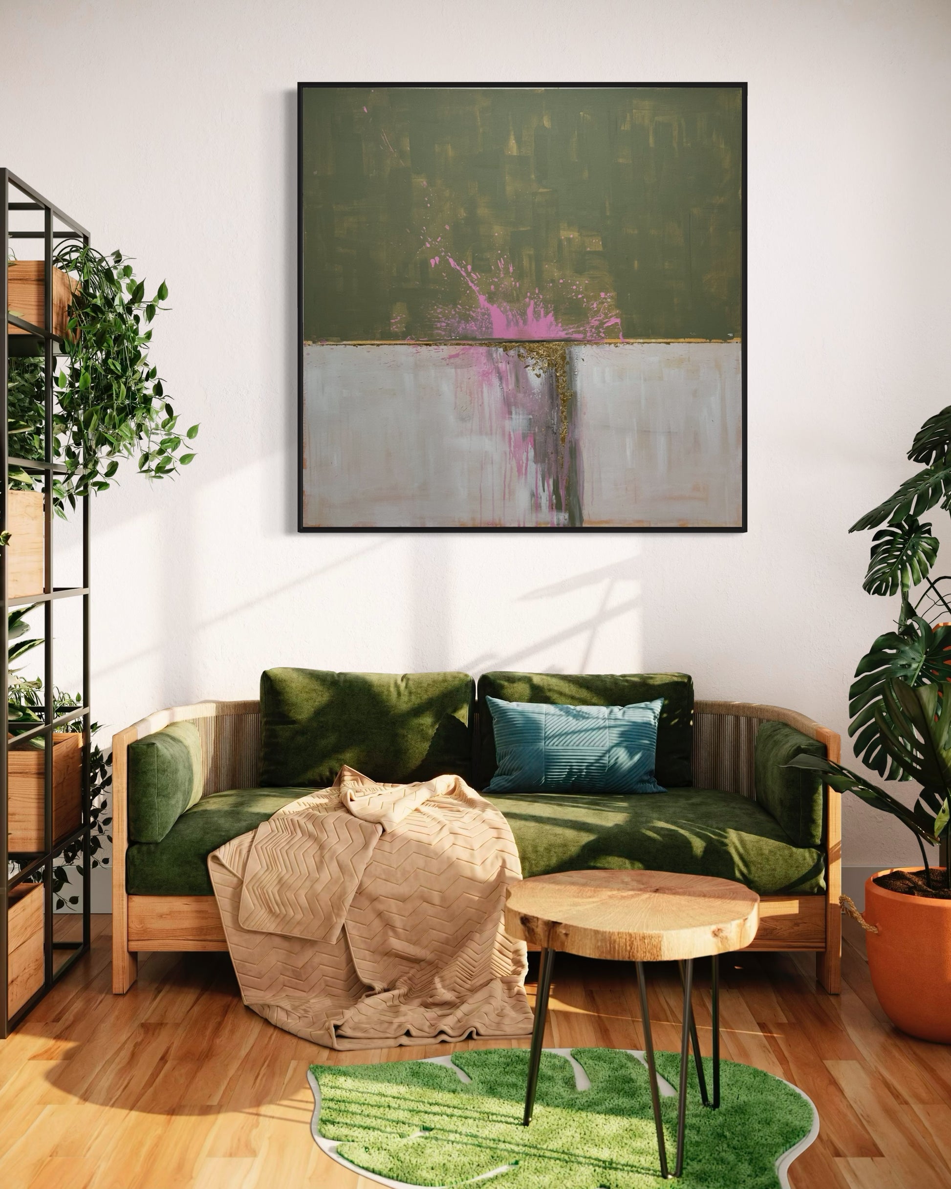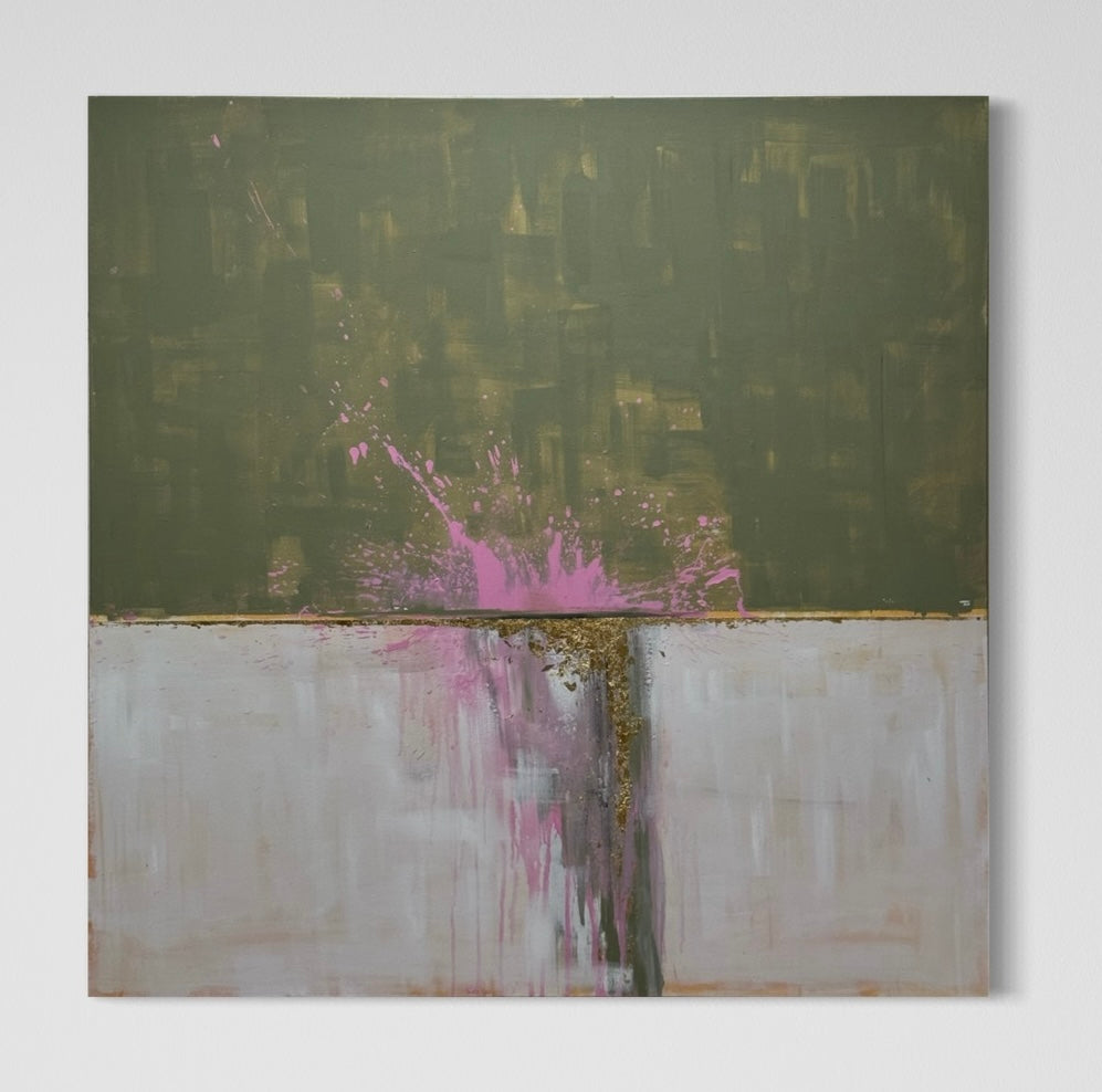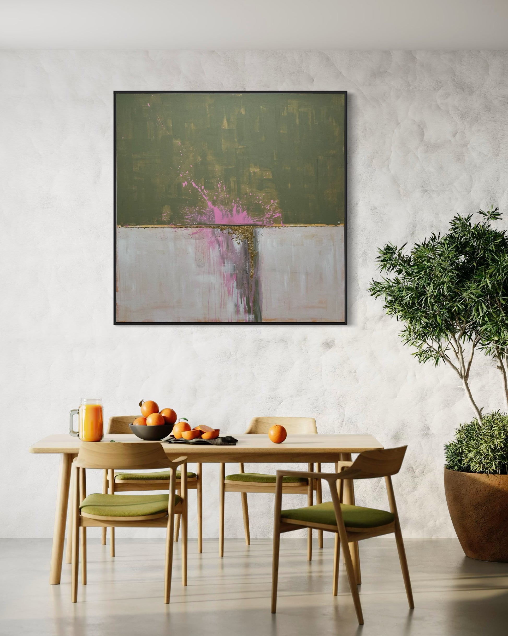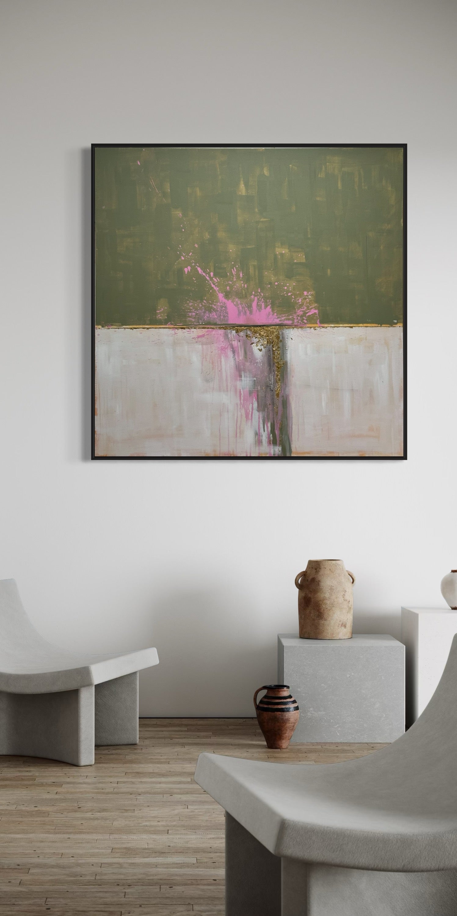 Pink Splash is a contemporary artwork that seamlessly combines gentle olive tones at the top with soft white at the base, evoking a refined and stylish aesthetic. A bold splash of pink, highlighted with gold accents, adds warmth and energy, creating a captivating focal point. The carefully blended colors come together to form a unique and visually striking piece, designed to enhance the elegance of any interior space.