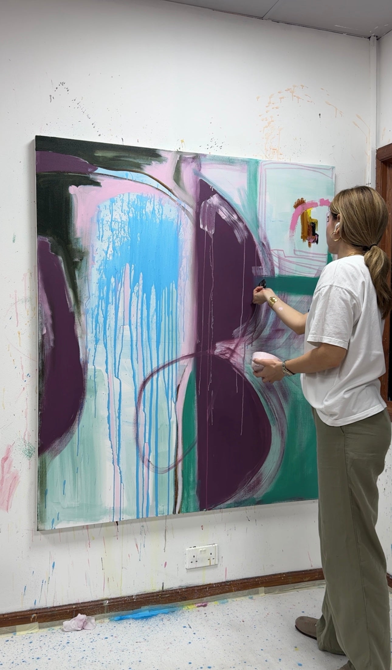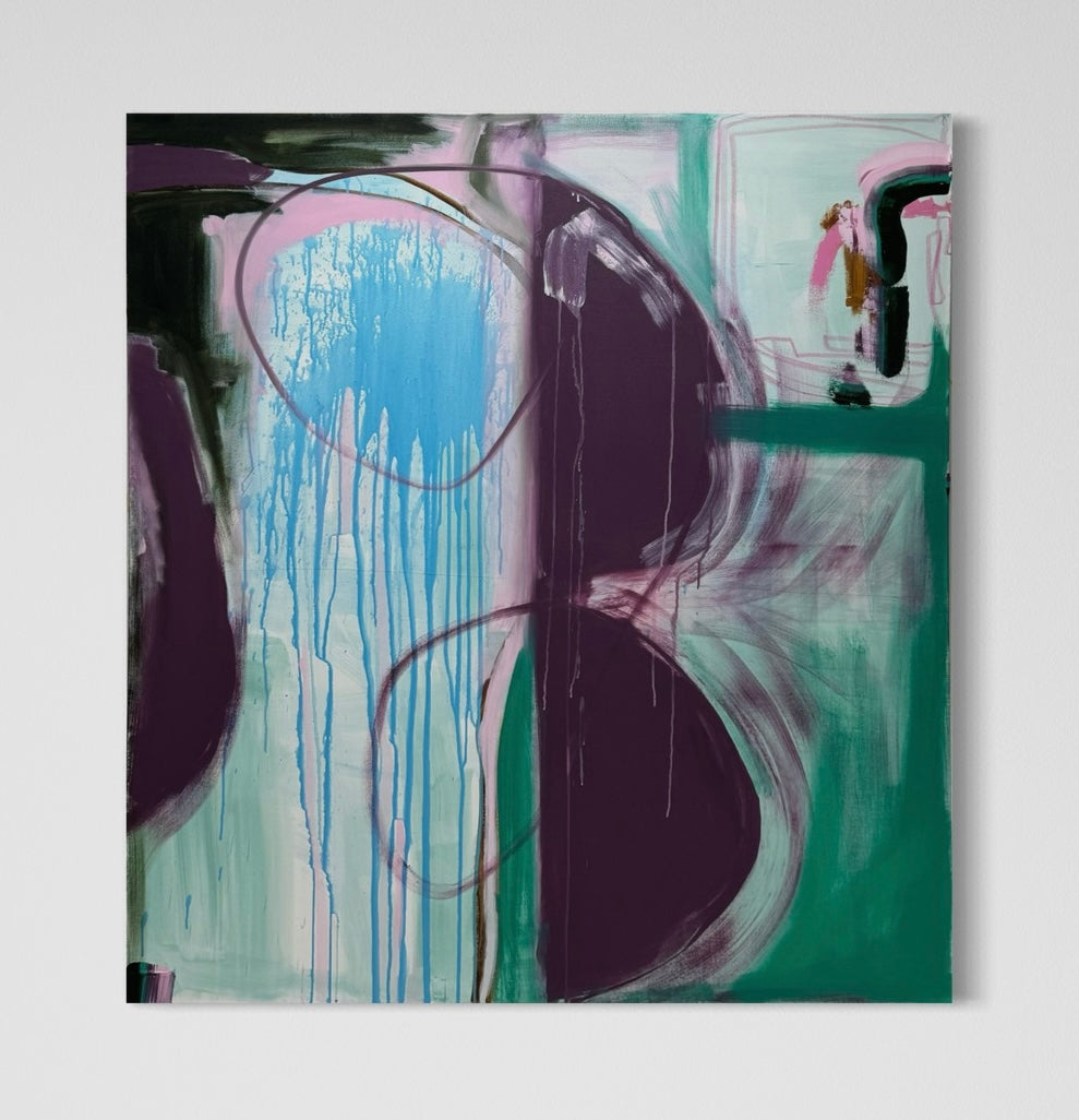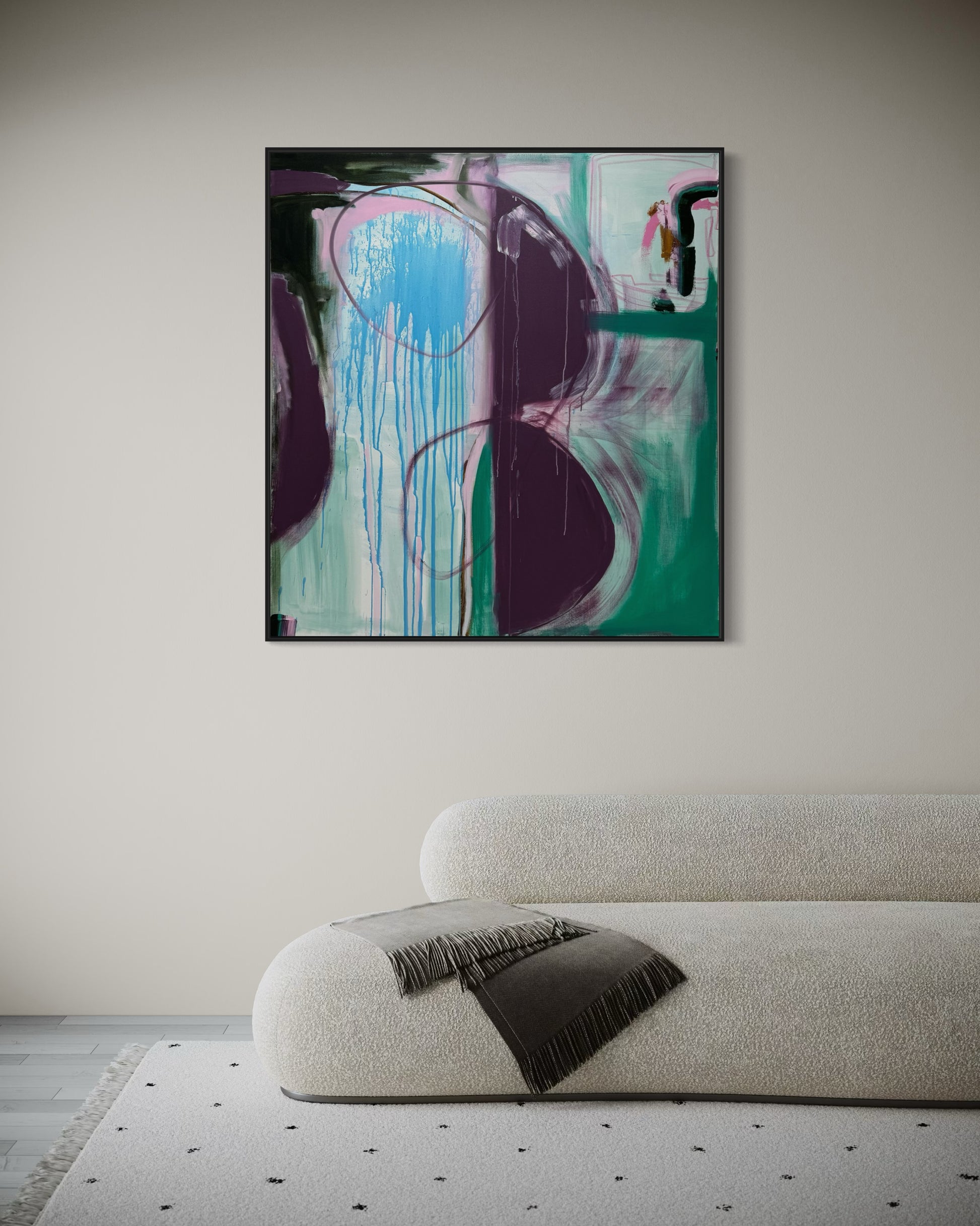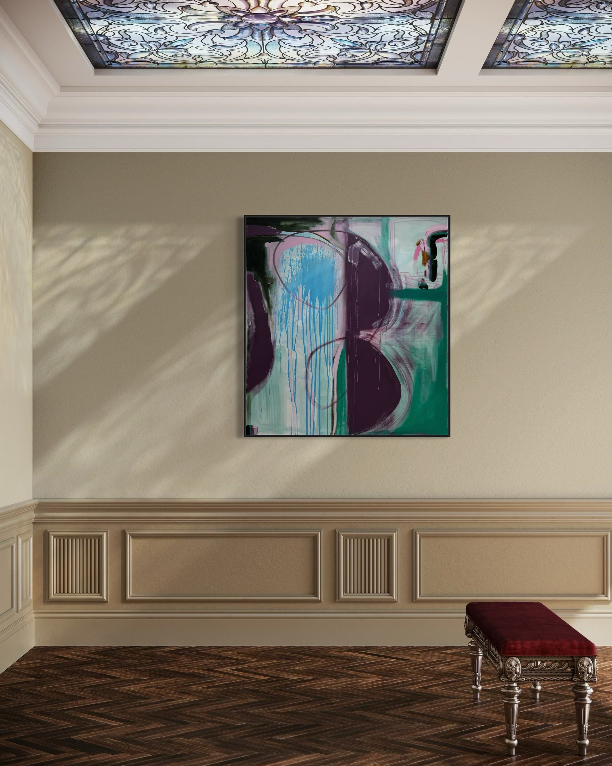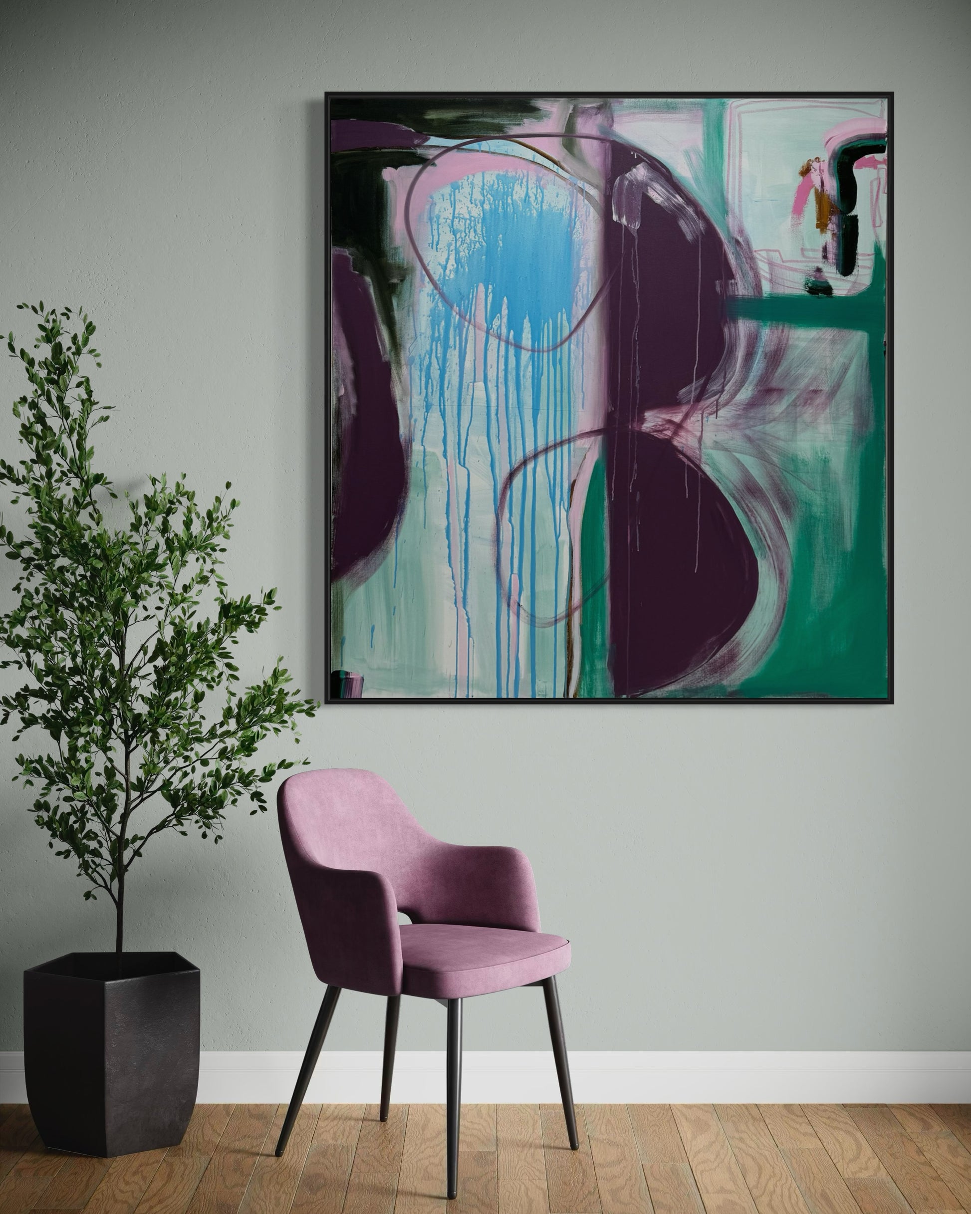 This large-scale artwork represents a journey of healing, moving from the depths of sorrow toward a place of joy and playfulness. The expansive canvas reflects the wide-reaching impact this piece can have, playing a significant role in transforming a space by adding character and boldness.
