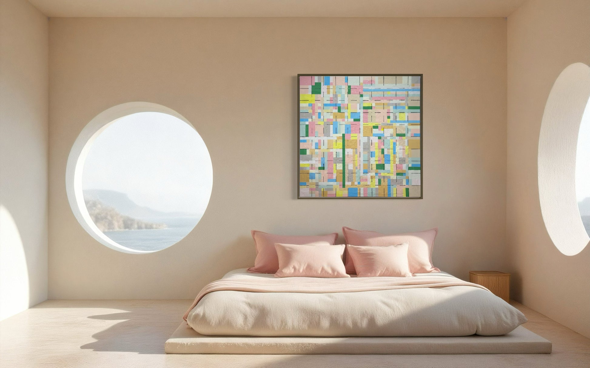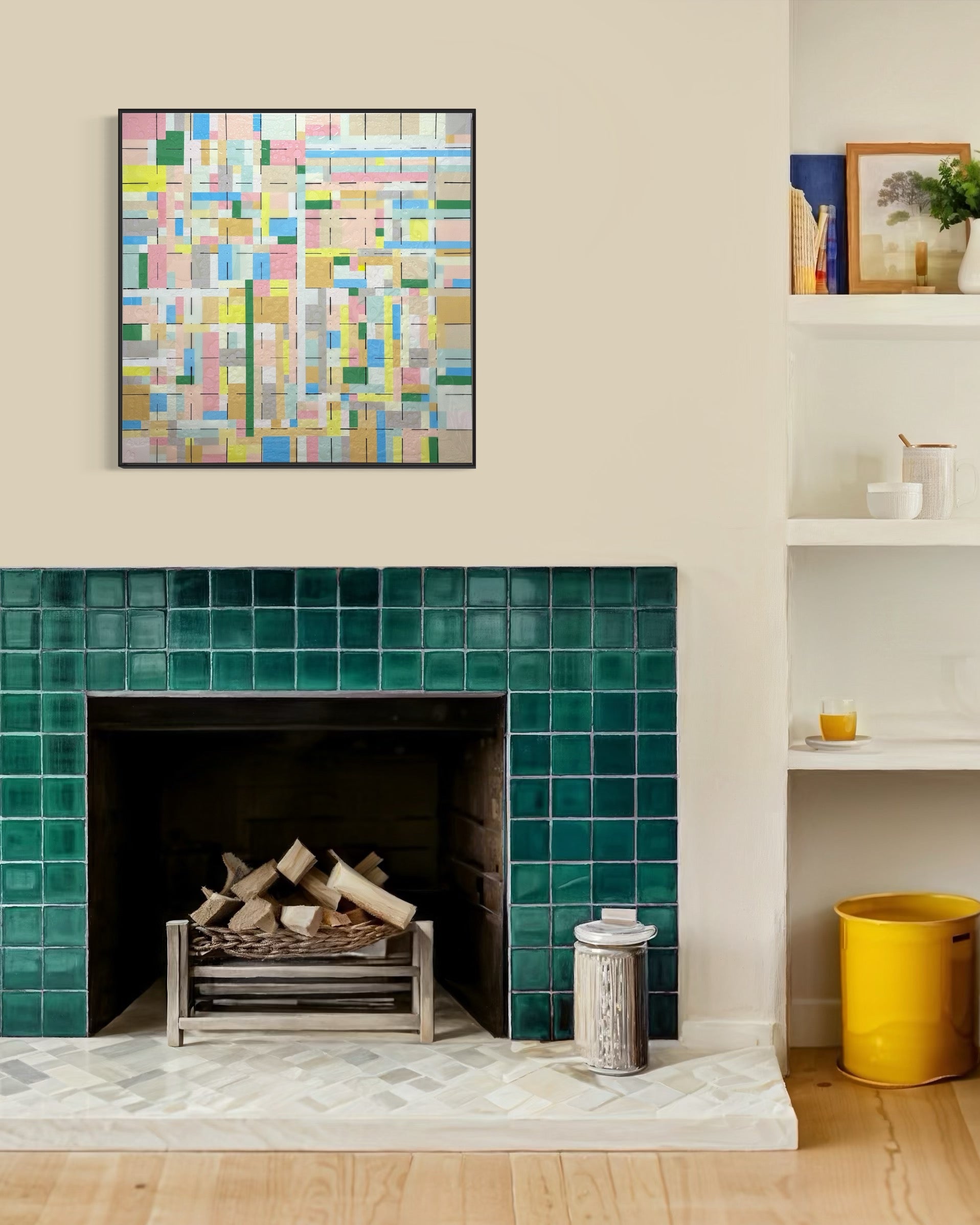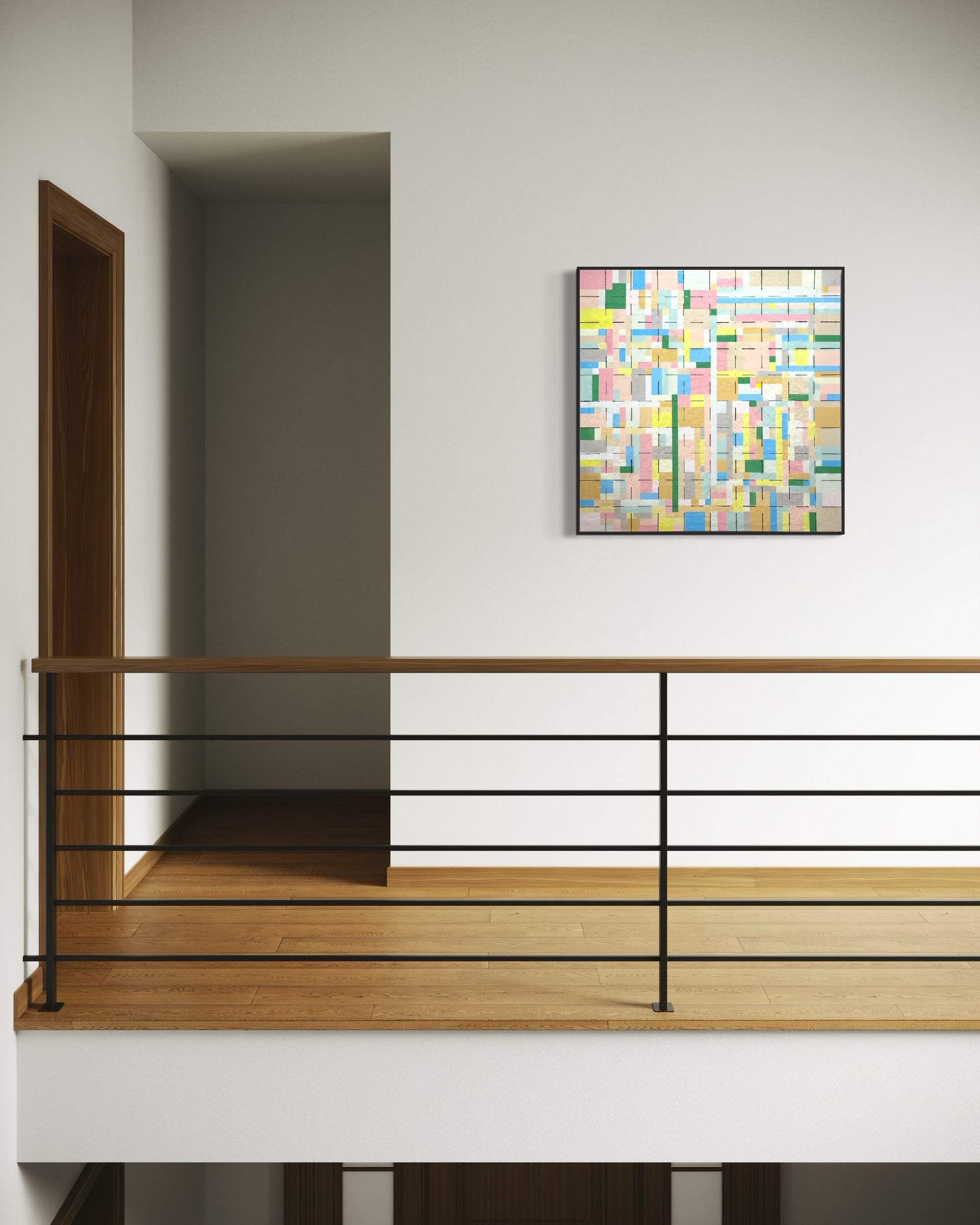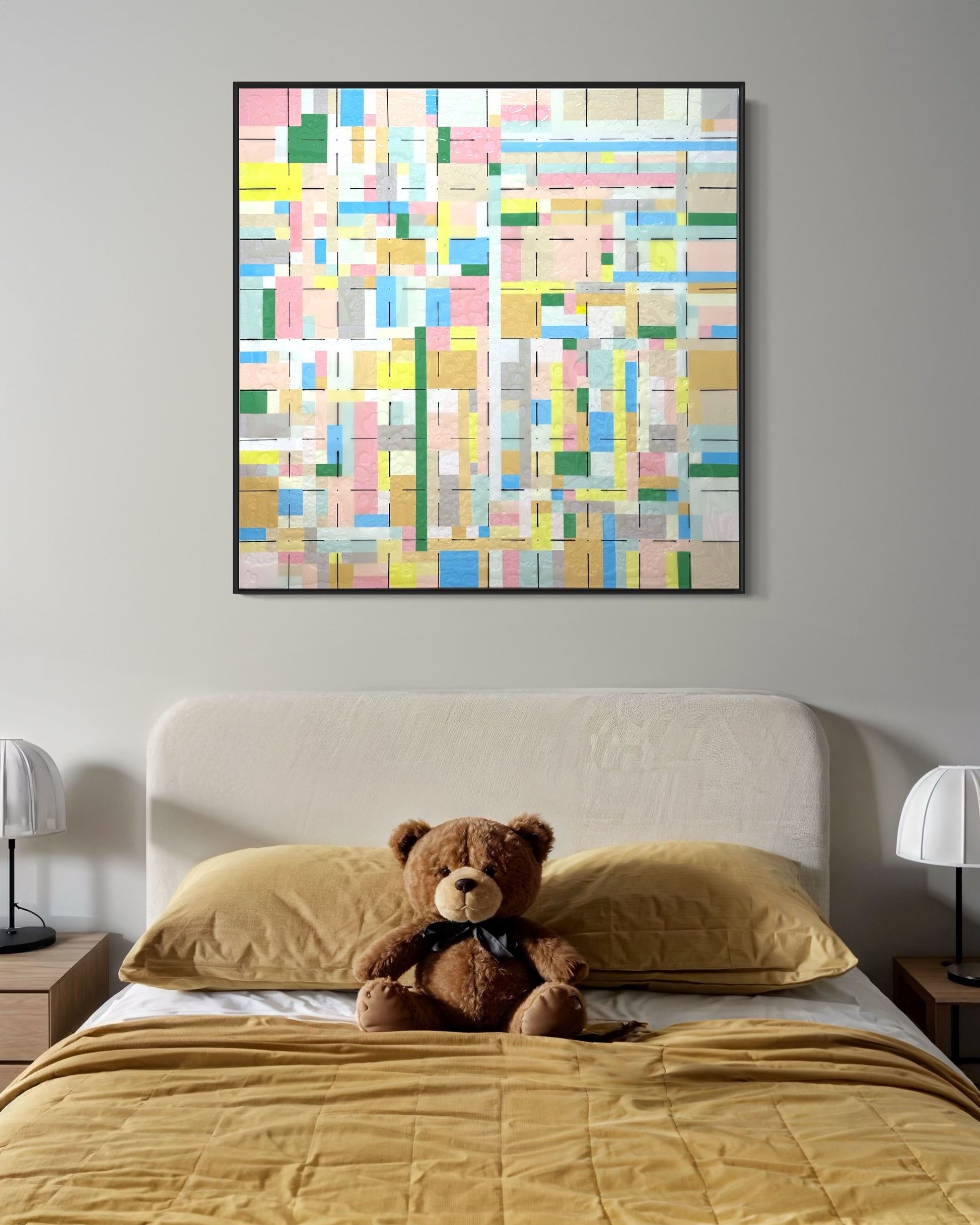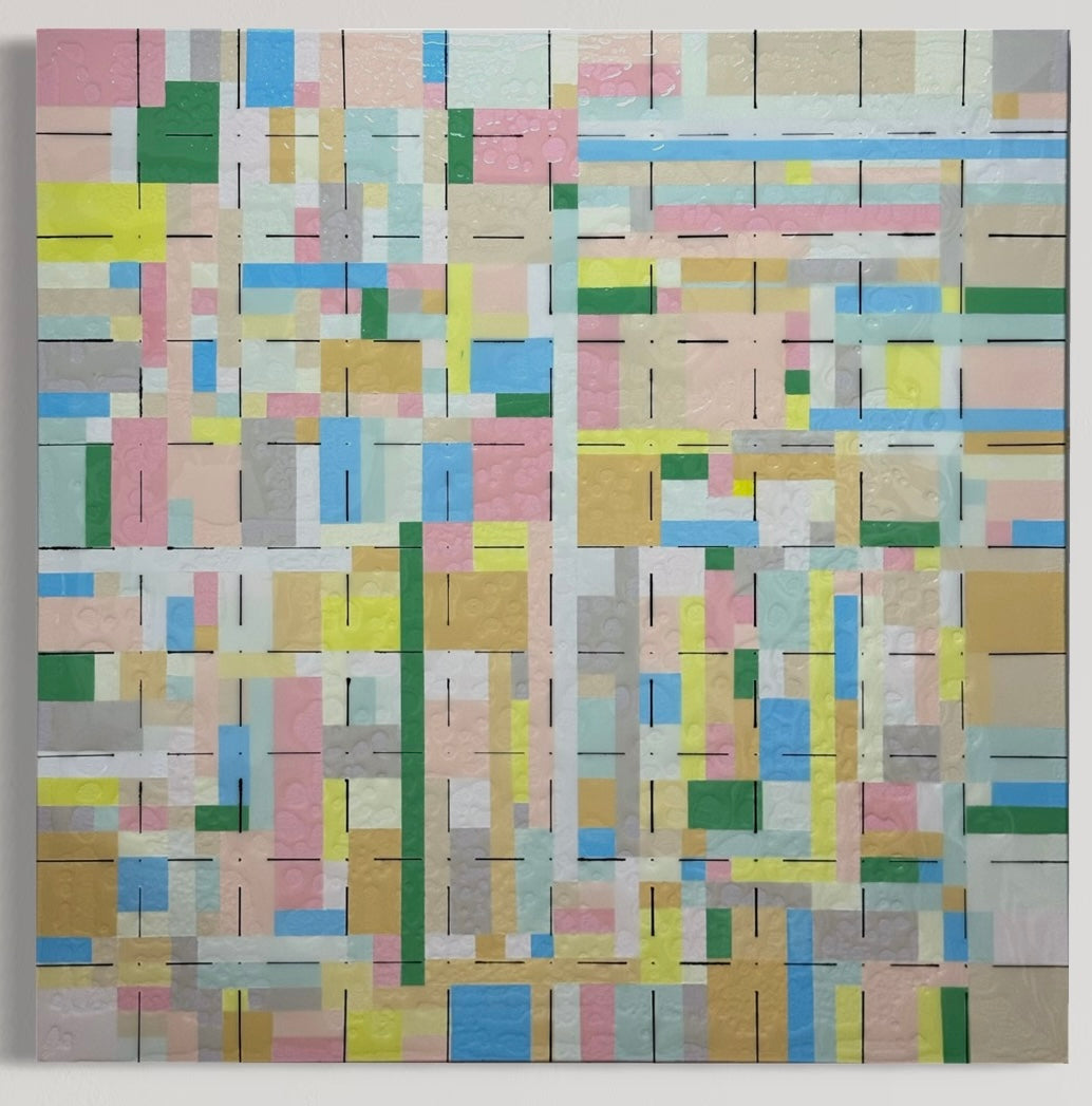 This artwork is a cute and colorful piece with soft pastel tones like pink, yellow, blue, and green, giving it a sweet, almost “yummy” feel—like candy for the eyes. The grid of rectangles feels playful and light, and the epoxy resin coating adds a glossy finish that makes the colors pop even more. It’s simple, cheerful, and fun to look at.